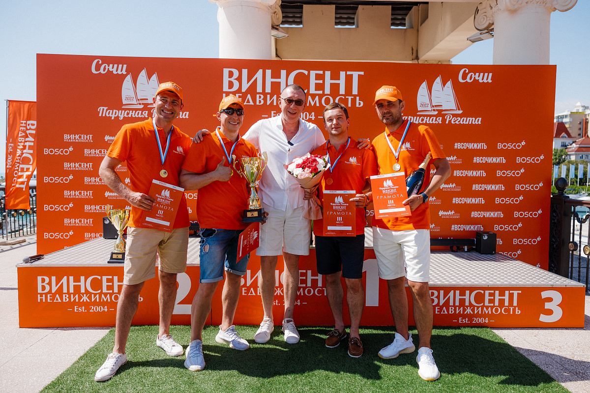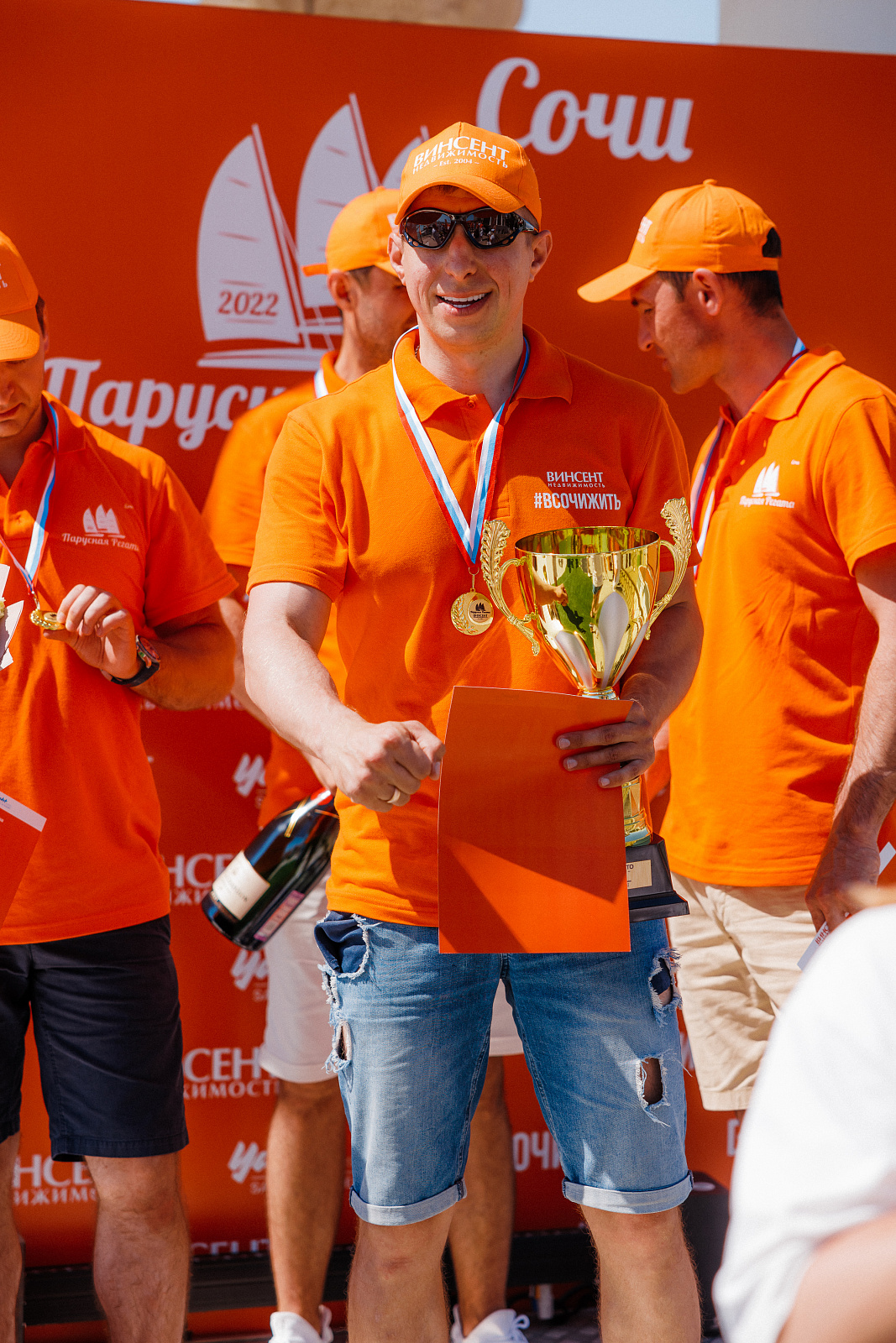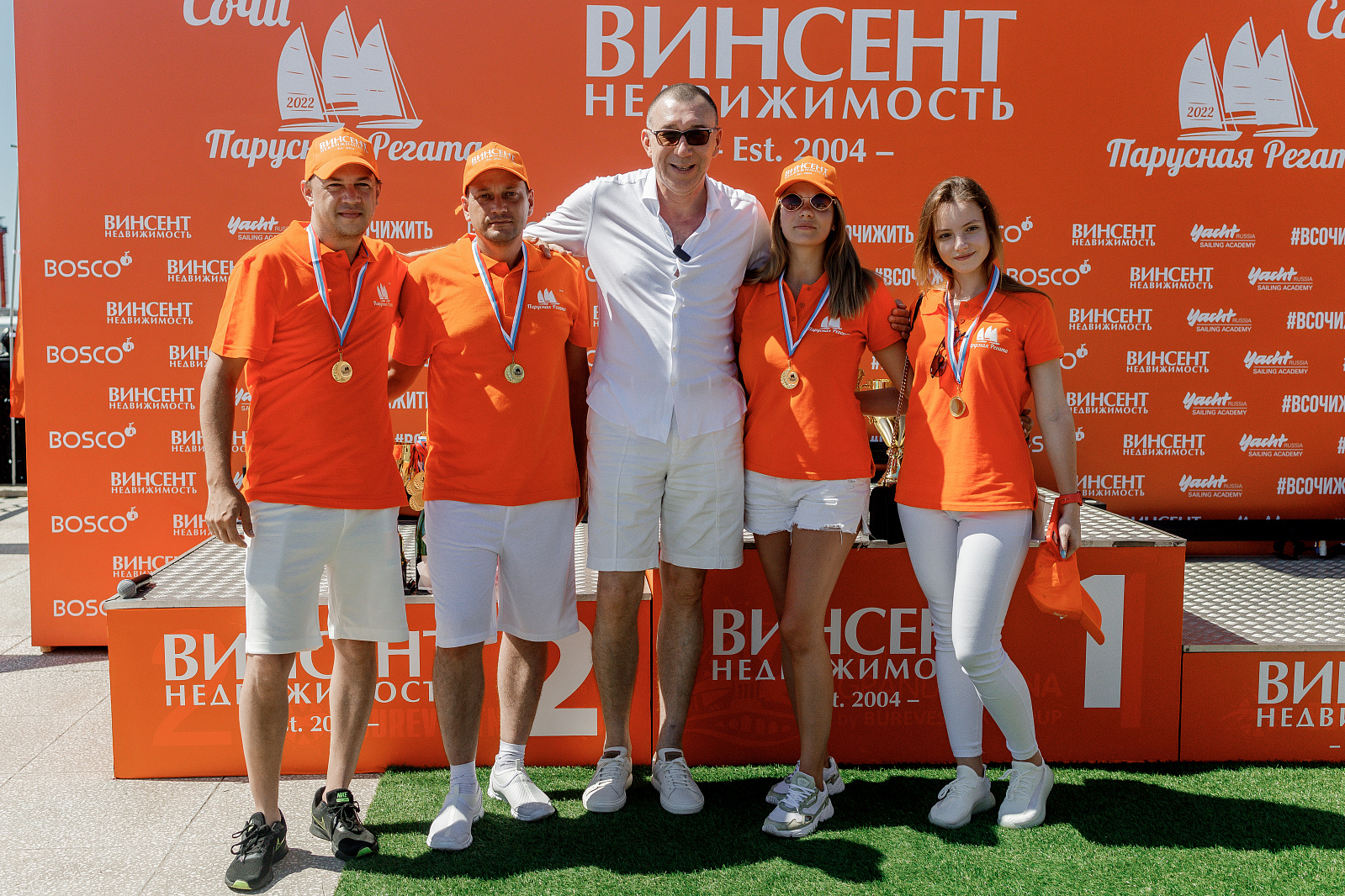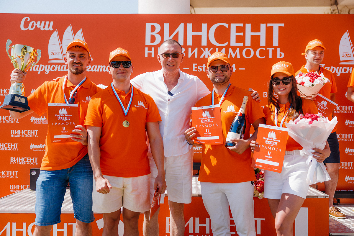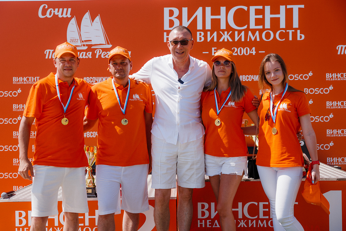 После завершения Парусной Регаты состоялась церемония награждения на открытой террасе морского вокзала Сочи. Каждый сотрудник получил памятную медаль с символикой Парусной Регаты «Винсент Недвижимость» 2022.