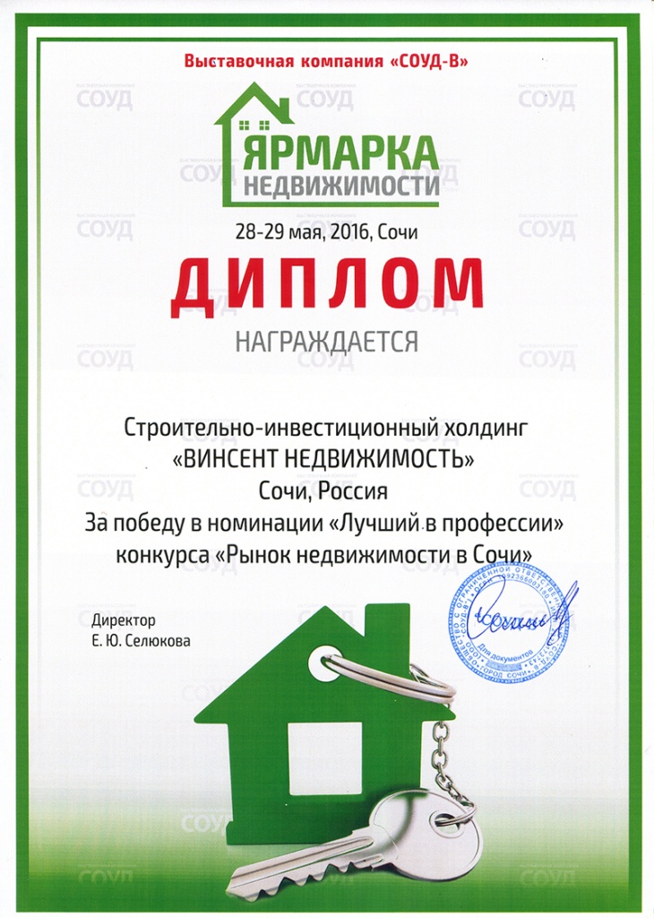 Руководство "Соуд-Сочинские выставки", организатор ярмарки высоко оценило вклад строительно-инвестиционного холдинга "Винсент Недвижимость" в развитие бизнеса жилой недвижимости в регионе и наградило почетной грамотой.