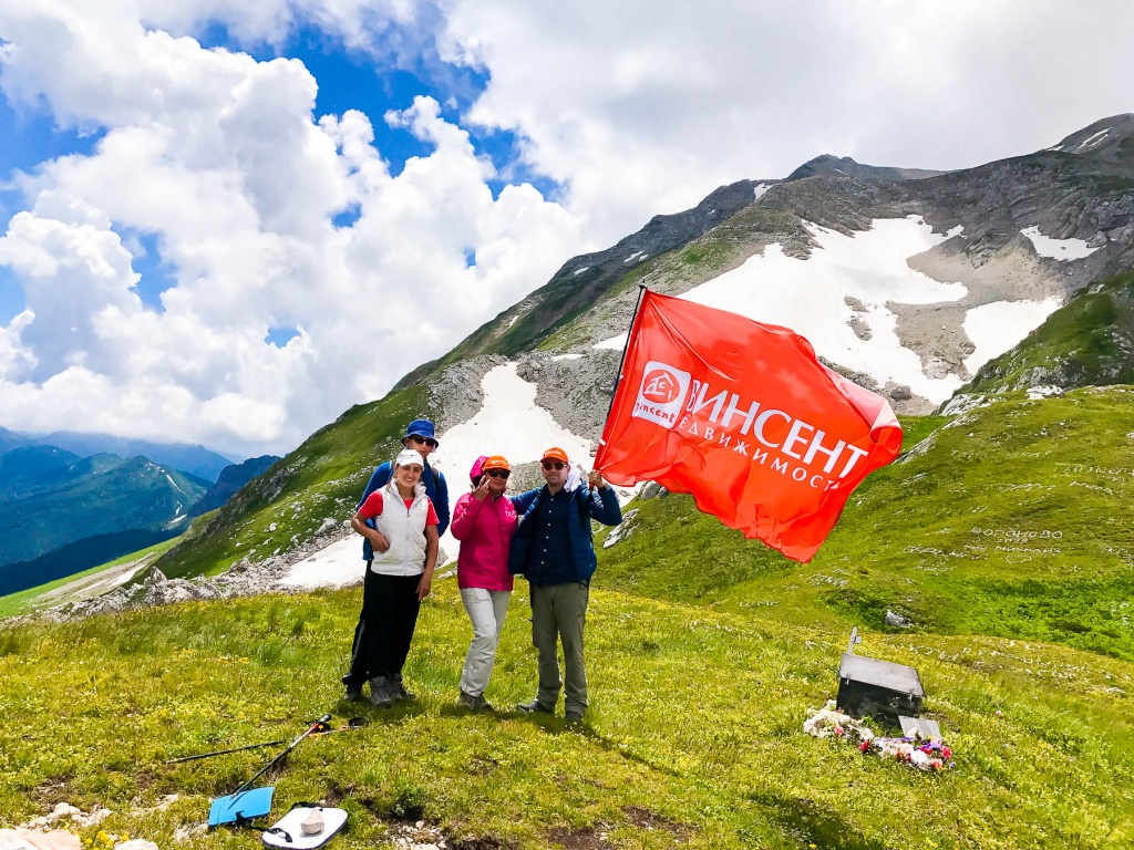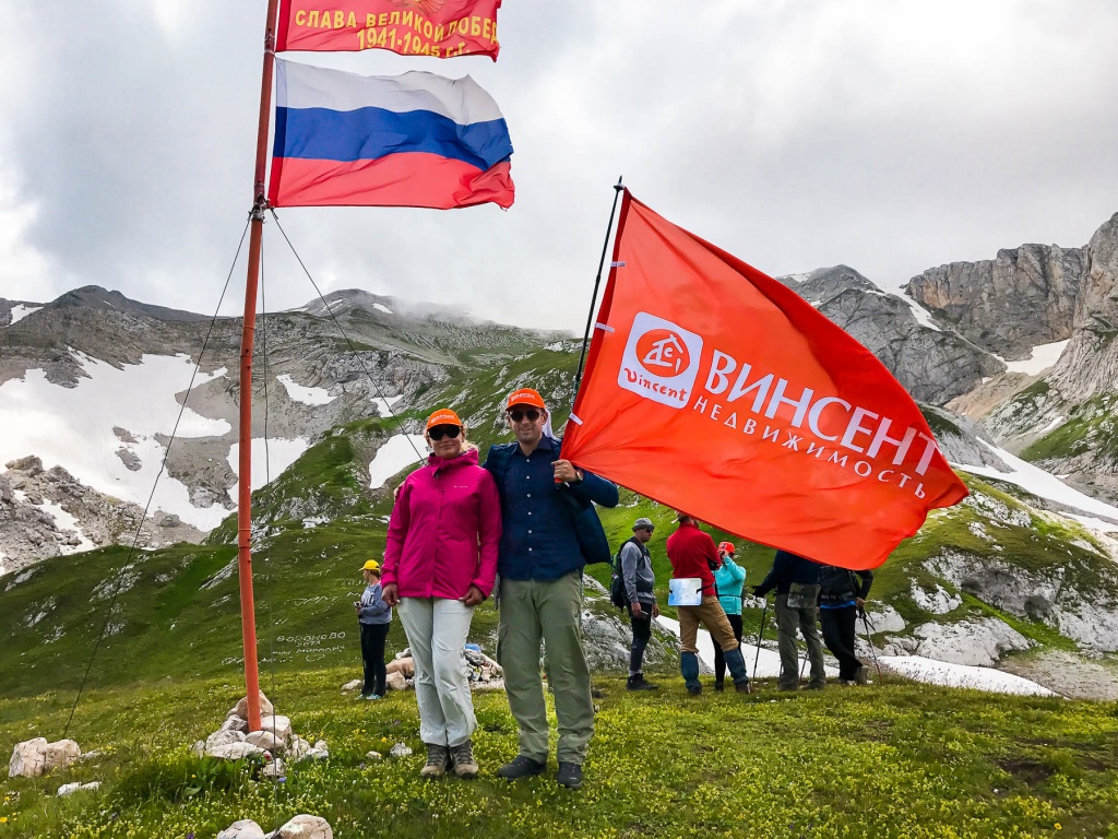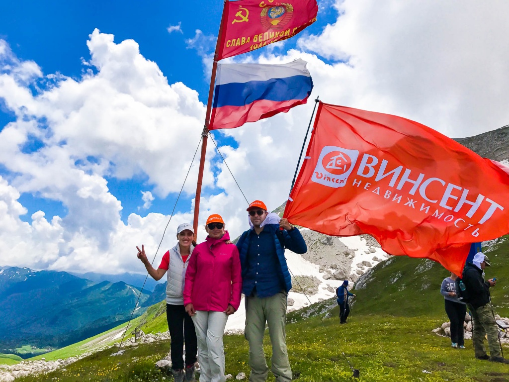 Во второй день, команда «Винсент Недвижимость» начала восхождение на Фишт-Оштенский перевал. Удивительная природа этих мест, захватывающие виды на ледники гор, редкие растения и чистейший воздух – произвели впечатление на каждого! А корпоративный ярко-оранжевый флаг «Винсент Недвижимость» развивается на предгорье самой высокой горной вершины «Фишт»!