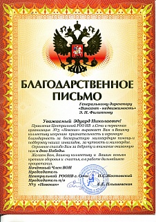 В данном разделе представлены официальные грамоты, дипломы и сертификаты, подтверждающие высокий уровень профессионализма наших сотрудников и их преданность своему делу! Статус и положительную репутацию агентства подтверждают благодарственные письма от наших партнеров и коллег по бизнесу, а также огромное количество отзывов от наших клиентов! Мы принимаем активное участие в разного рода мероприятиях и конкурсах, направленных на улучшение качества услуг, предоставляемых нашей организацией. Также компания «Винсент Недвижимость» занимается благотворительной деятельностью и зачастую выступает в роли спонсора бюджетных учреждений, оказывает помощь ветеранам Великой Отечественной Войны и лицам с ограниченными физическими возможностями.