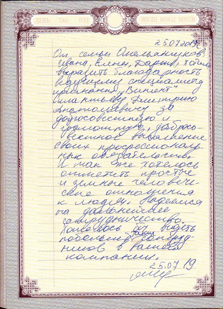 От семьи Омельянчуков Ивана, Елены, Дарьи. Хотим выразить благодарность ведущему специалисту компании «Винсент Недвижимость» Силантьеву Дмитрию Анатольевичу за грамотное и добросовестное выполнение своих профессиональных обязательств. И так же хотелось отметить простые и земные человеческие отношения к людям. Надеемся на дальнейшее сотрудничество. Хотелось бы видеть побольше таких сотрудников в вашей компании.