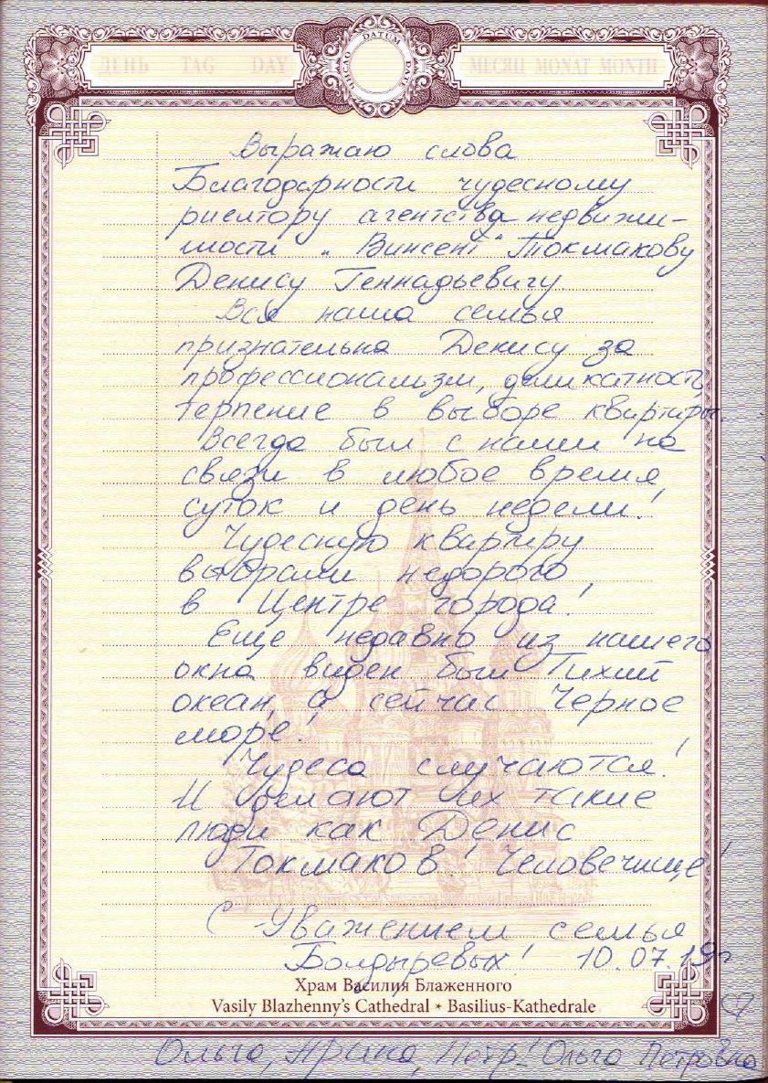 Выражаю слова благодарности чудесному риэлтору агентства «Винсент Недвижимость» Токмакову Денису Геннадьевичу. Вся наша семья признательна Денису за профессионализм, деликатность, терпение в выборе квартиры. Всегда был с нами на связи в любое время суток и день недели. Чудесную квартиру выбрали недорого в центре города. Еще недавно из нашего окна виден был тихий океан, а сейчас черное море! Чудеса случаются! И делают их такие люди как Денис Токмаков.