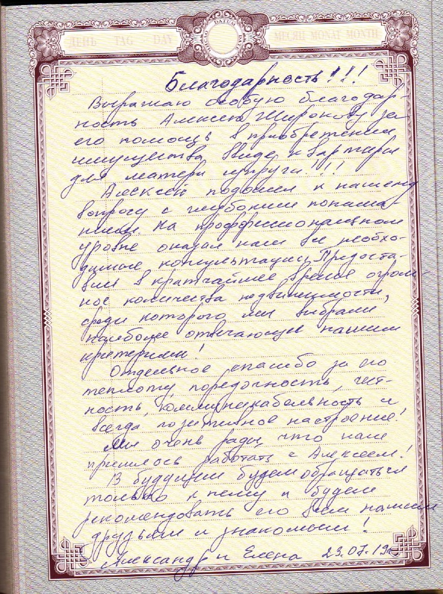 Выражаю особую благодарность Алексею Широкову за его помощь в приобретении имущества в виде квартиры для матери супруги!