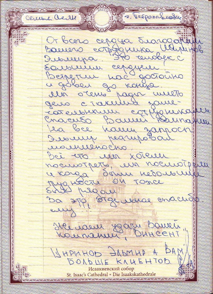 От всего сердца благодарим вашего сотрудника Ширинова Эльмира. Это человек с большим сердцем! Встретил нас достойно и довел до конца. Мы очень рады иметь дело с таким замечательным сотрудником. Спасибо вашей компании. На все наши запросы, Эльмир реагировал молниеносно. Все что мы хотели посмотреть, мы посмотрели и когда были небольшие трудности, он тоже был рядом. За это отдельное спасибо ему. Желаем удачи компании «Винсент Недвижимость».