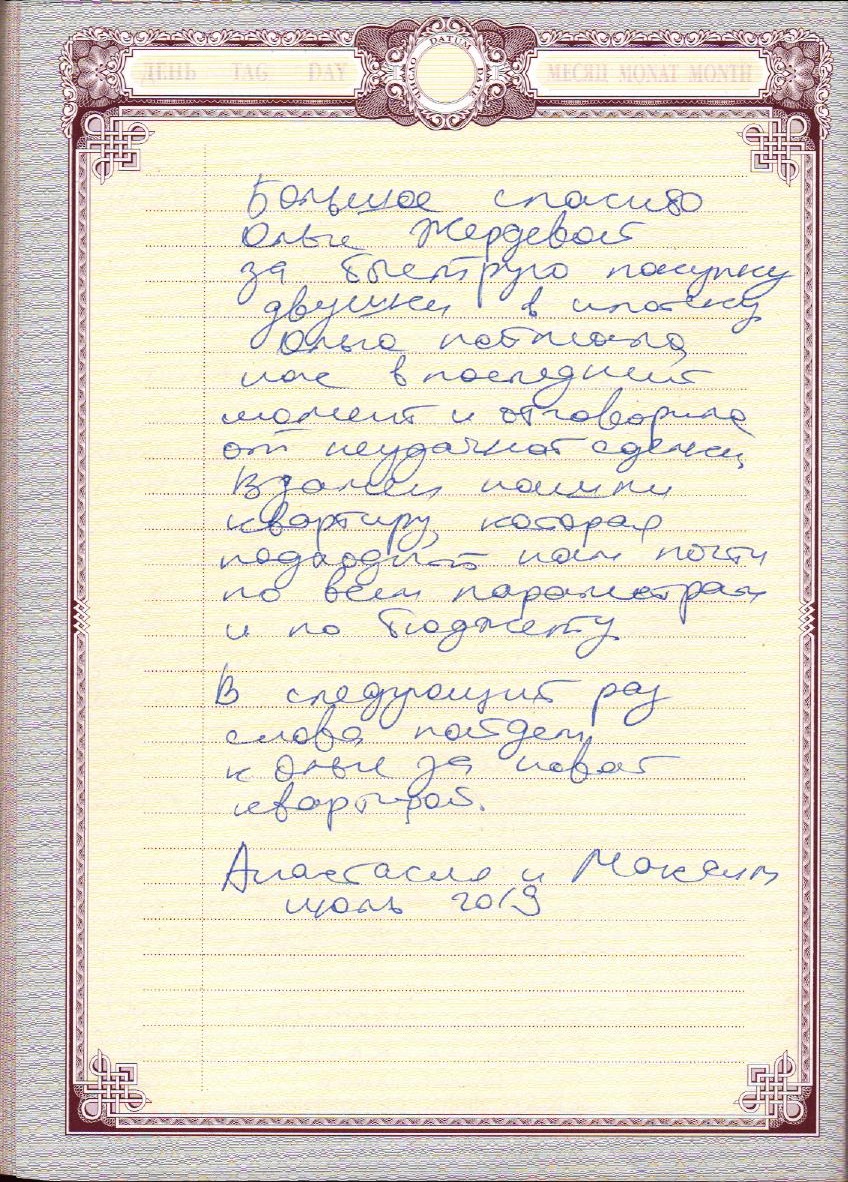 Большое спасибо Ольге Жердевой за быструю покупку двушки в ипотеку. Ольга поймала нас в последний момент и отговорила от неудачной сделки. Взамен нашли квартиру, которая подошла нам почти по всем параметрам и по бюджету. В следующий раз снова пойдем к Ольге за новой квартирой.