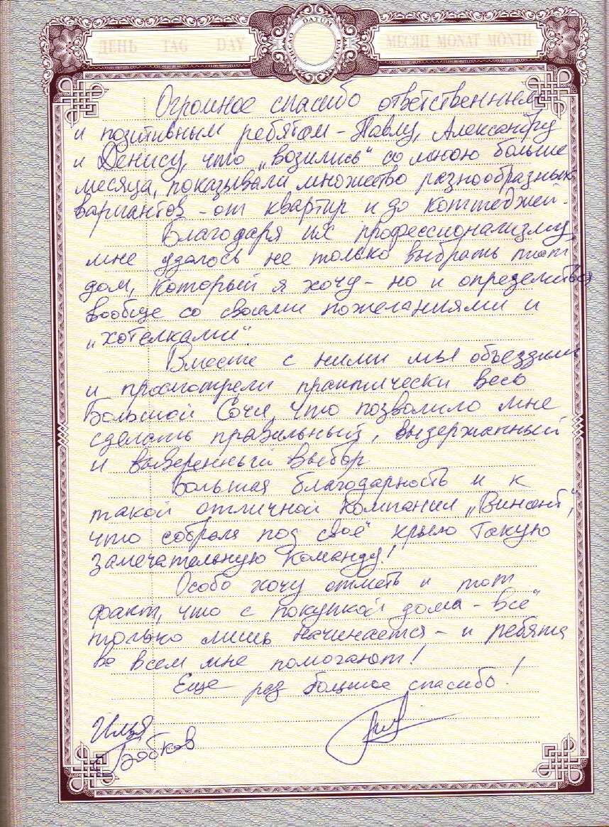 Огромное спасибо ответственным и позитивным ребятам — Павлу Малхасяну, Александру Куркину, Денису Зомореву, что работали со мной больше месяца. Ребята показывали множество разнообразных вариантов квартир до коттеджей. Благодаря их профессионализму, мне удалось не только выбрать тот дом, который я хочу, но и определится со своими пожеланиями и «хотелками». В месте с ними мы объездили и просмотрели практически весь Большой Сочи, что позволило мне сделать правильный, выдержанный и выверенный выбор. Большая благодарность и к такой отличной команде «Винсент Недвижимость», что собрали под свое крыло такую замечательную команду! Особо хочу отметить и тот факт, что с покупкой дома — все только начинается и ребята во всем помогают! Еще раз большое спасибо!