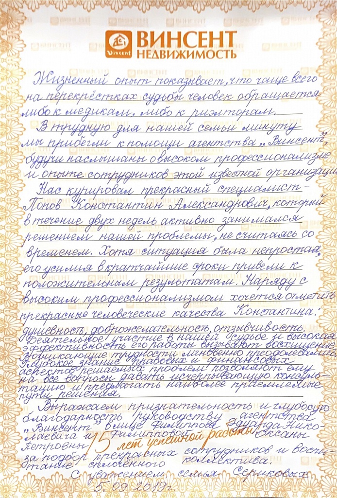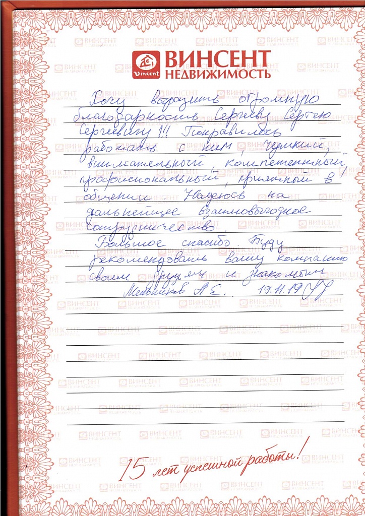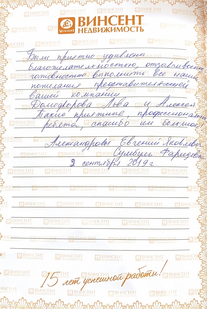 Выражаем признательность и глубокую благодарность руководству агентства «Винсент Недвижимость» в лице Филиппова Эдуарда Николаевича и Филипповой Оксаны Петровны за подбор прекрасных сотрудников и воспитание сплочённого коллектива!