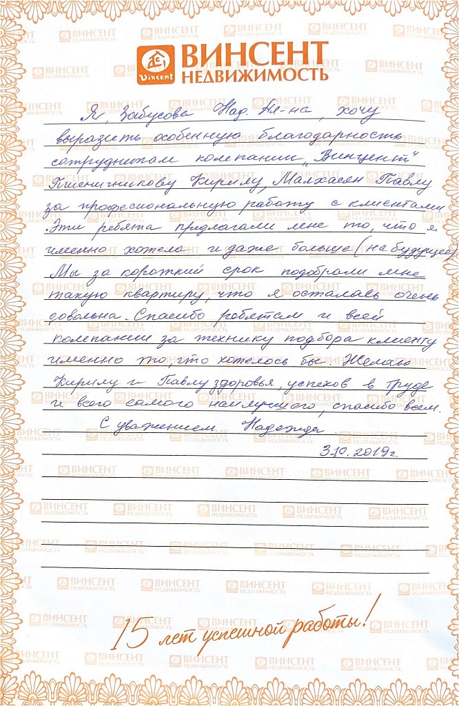 Я, Забусова Надежда Александровна, хочу выразить особенную благодарность сотрудникам компании «Винсент недвижимость», а именно Пшеничникову Кириллу и Малхасян Павлу за профессиональную работу с клиентами. Эти ребята предлагали мне то, что я именно хотела и даже больше.