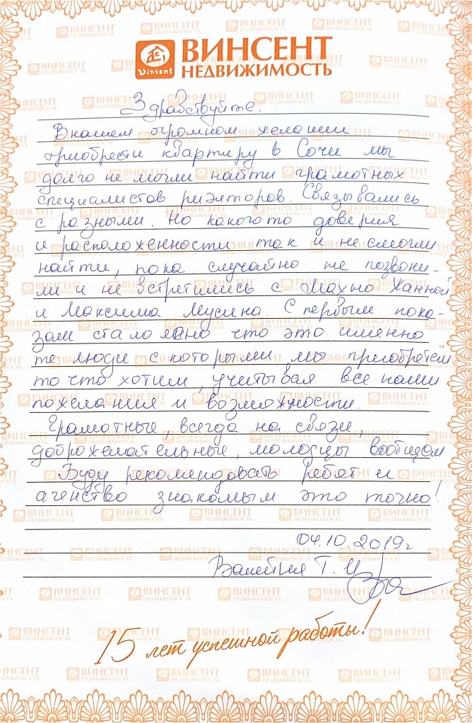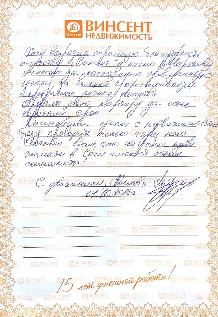 Хочу выразить огромную благодарность агентству «Винсент Недвижимость» и лично широкому Алексею за качественно проведённую сделку за высокий профессионализм и прекрасные личные качества. Продала свою квартиру за очень короткий срок. Дальнейшие сделки с недвижимостью буду проводить только через него. Спасибо вам, что на рынке недвижимости в Сочи имеются такие специалисты! С уважением Малькова Татьяна.