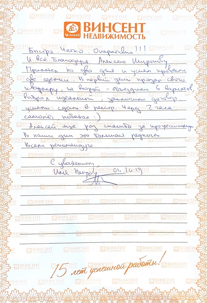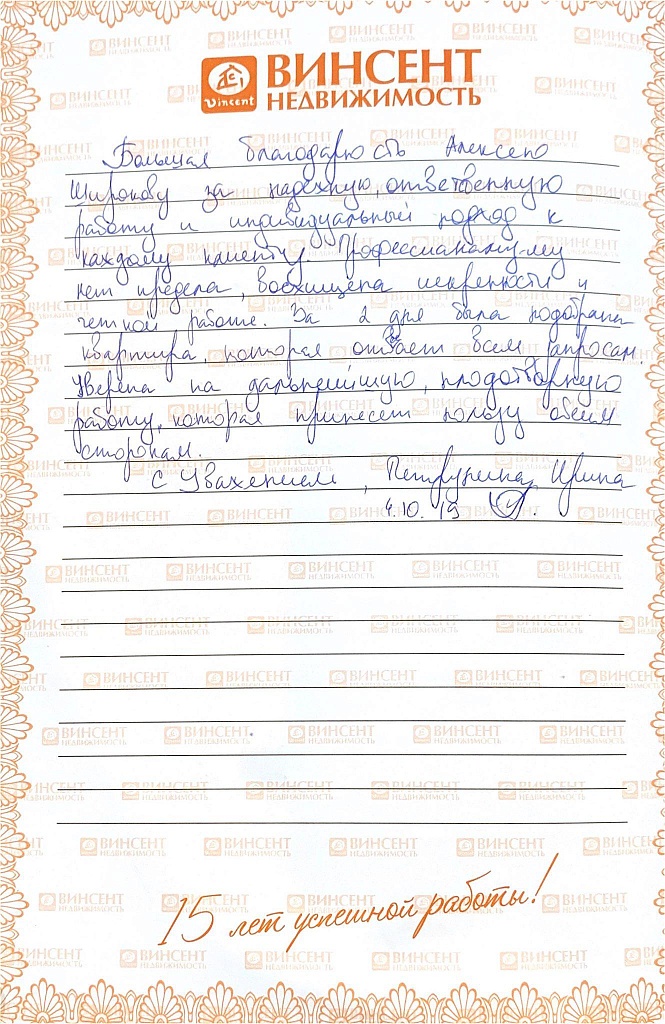 Большая благодарность Алексею Широкову за надёжную ответственную работу и индивидуальный подход к каждому клиенту. Профессионализму нет придела, восхищена искренности и чёткой работе. За два дня была подобрана квартира, которая отвечает всем запросам. Уверена на дальнейшую плодотворную работу, которая принесёт пользу обеим сторонам. С уважением, Петрунина Ирина.