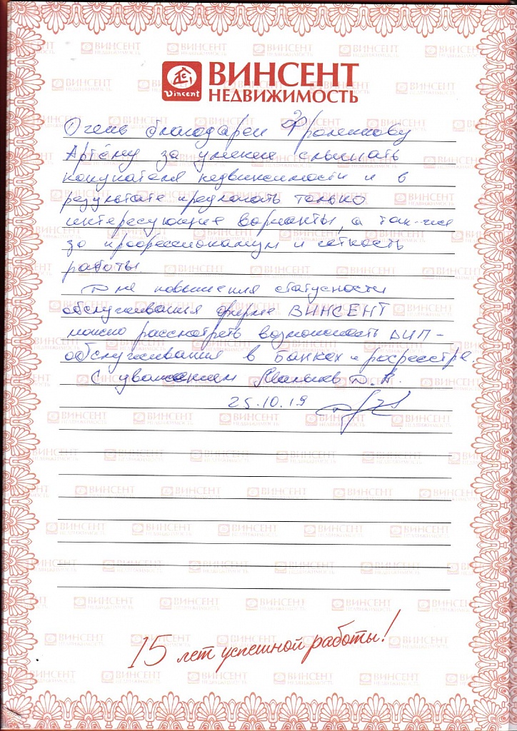 Очень благодарен Фроленкову Артему за умение слышать покупателя недвижимости и в результате предлагать только интересующие варианты, а также за профессионализм и четкость работы. Для повышения статусности обслуживания компании «Винсент Недвижимость» можно рассмотреть возможность ВИП-обслуживания в банках и Росреестре.