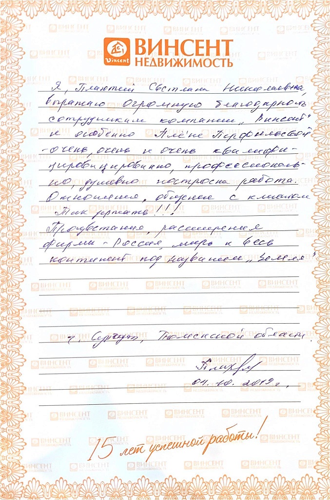Я, Плахтий Светлана, выражаю огромную благодарность сотрудникам компании «Винсент недвижимость» особенно Алене Перфильевой, очень квалифицированно, профессионально и душевно построена работа. Отличное общение с клиентом, так держать!
