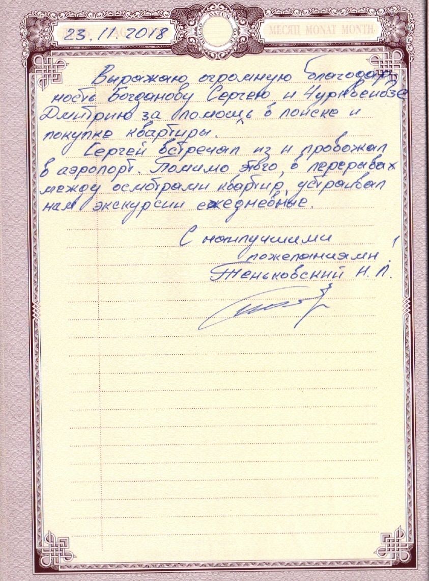 Выражаю огромную благодарность Богданову Сергею и Чурквеидзе Дмитрию за помощь в поиске и покупке квартиры. Ребята нас встречали и провожали в аэропорт. Помимо этого, в перерывах между осмотрами квартир, устраивали нам ежедневные экскурсии по городу Сочи.