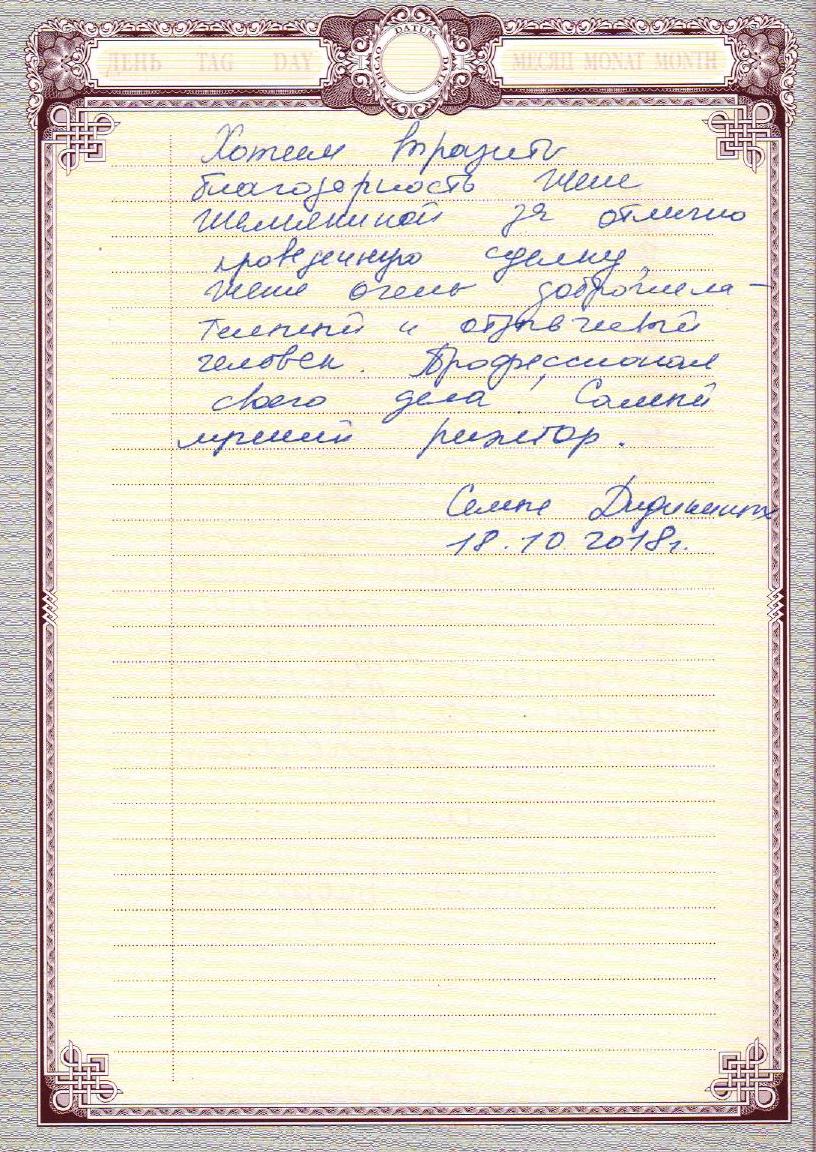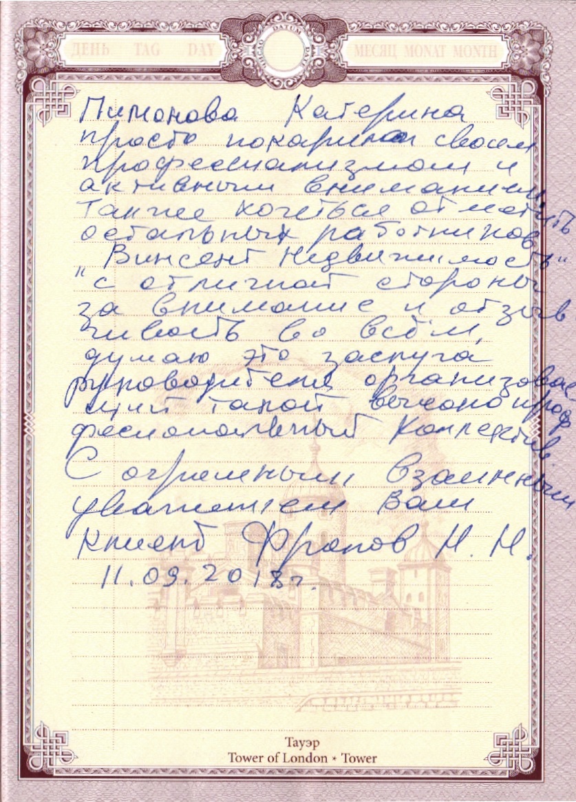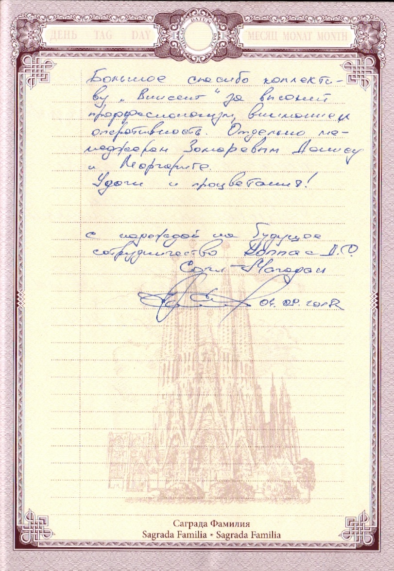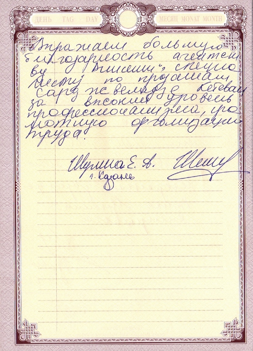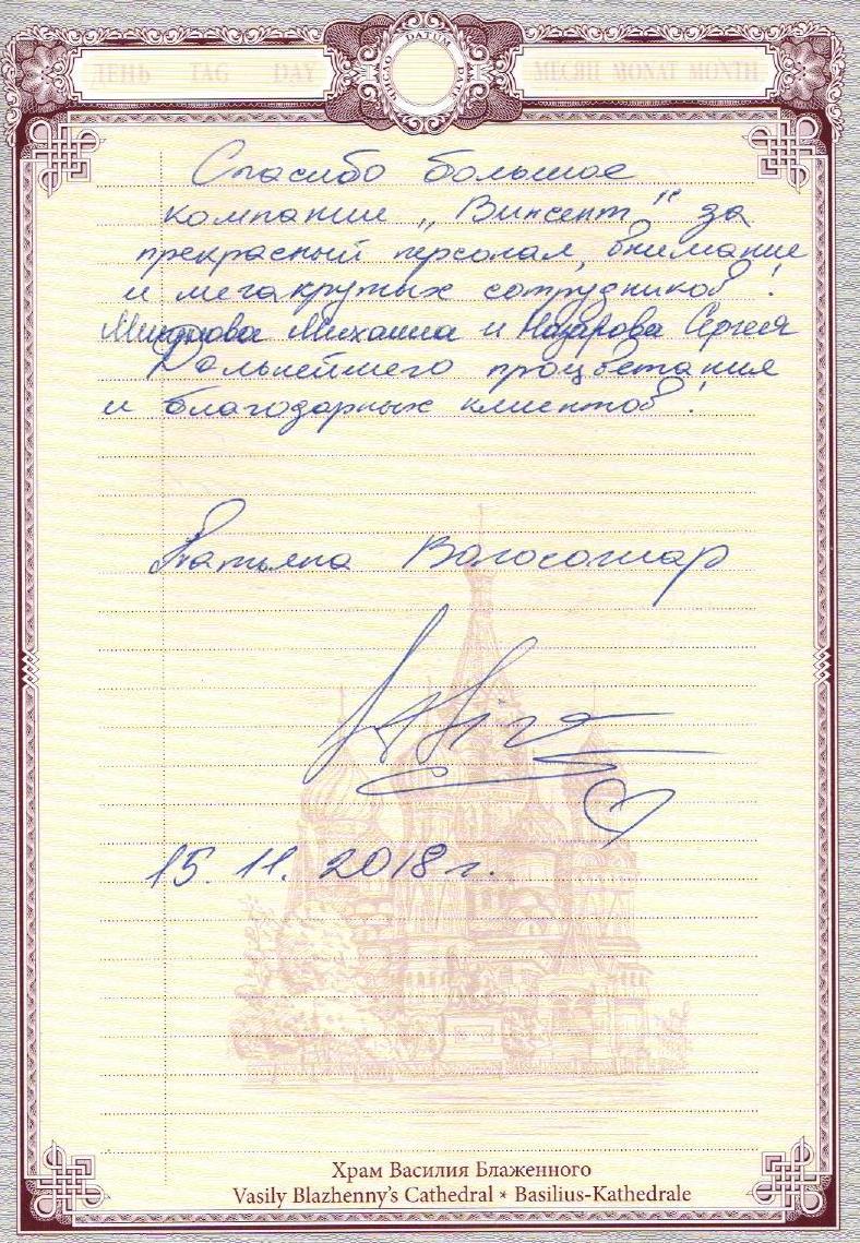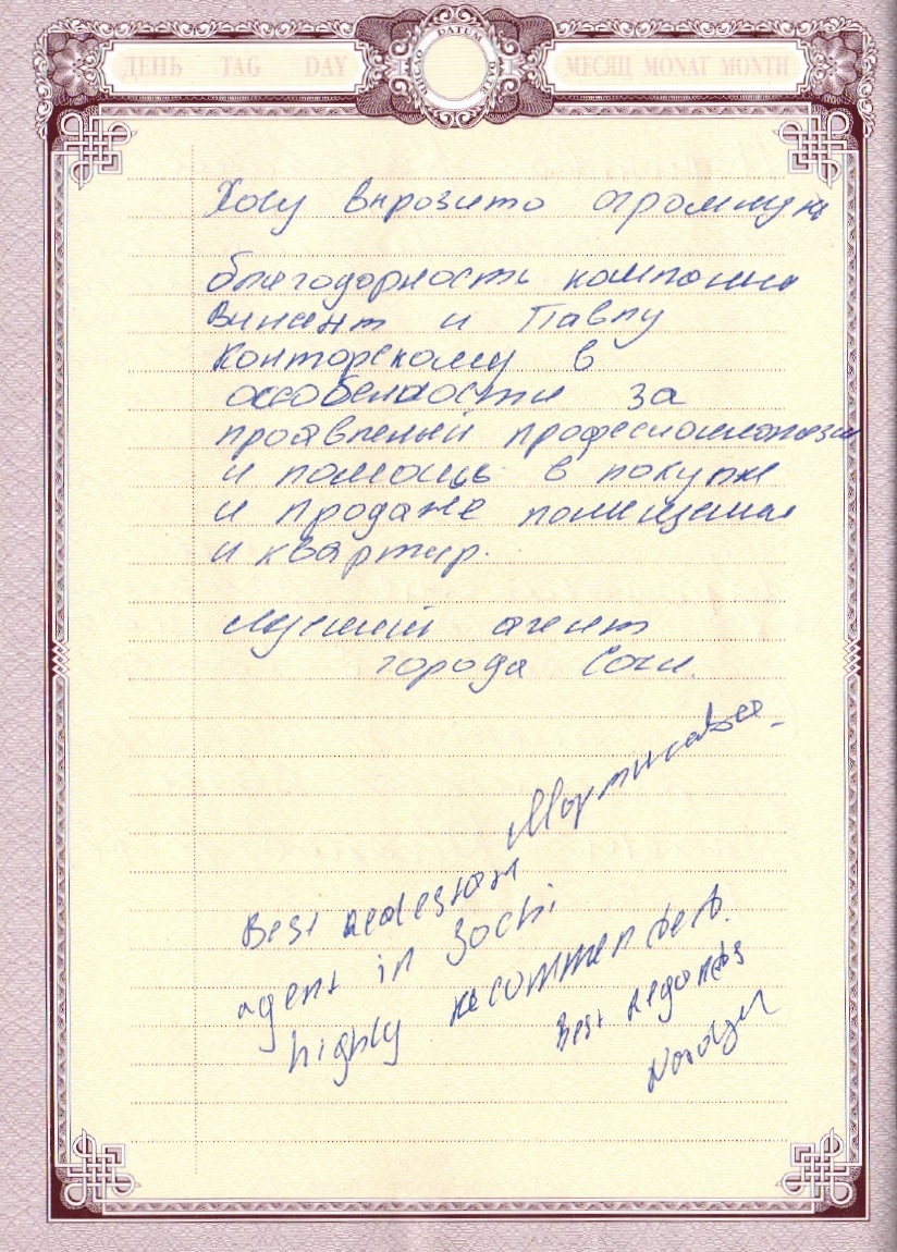 Выражаю огромную признательность агентству «Винсент недвижимость» за профессиональную работу. Особо хочу отметить сотрудников Шарвашидзе Лаврентия и Шушания Акакия за теплоту, заботу и грамотно поставленную работу по подбору недвижимости в г. Сочи. Желаю Вам всего самого лучшего и дальнейшего процветания!