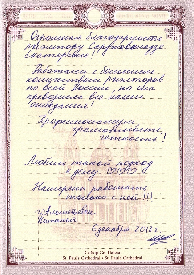 Огромная благодарность риелтору Сарджвеладзе Екатерине! Работали с большим количеством риелторов по всей России, но она превзошла все наши ожидания! Профессионализм, грамотность, четкость! Любим такой подход к делу, намерены работать только с ней!