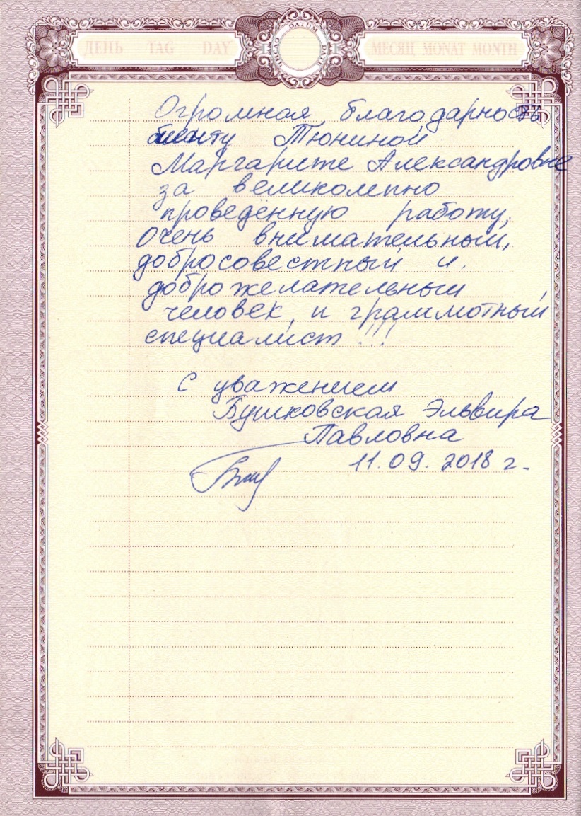 Огромная благодарность агенту Тюниной Маргарите Александровне за великолепно проведенную работу, очень внимательный, добросовестный и доброжелательный человек и грамотный специалист!!!