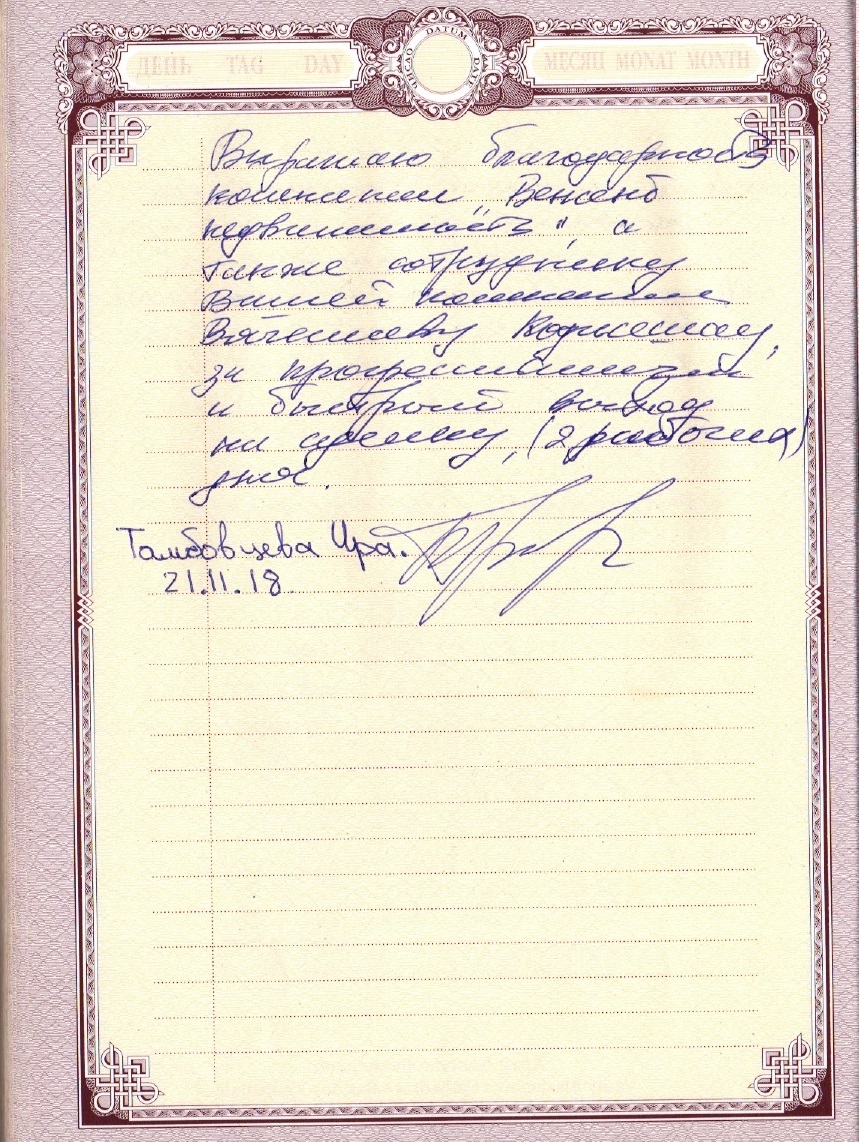 Выражаю благодарность копании «Винсент Недвижимость», в частности сотруднику компании Вячеславу Коджешау за профессионализм и за быстрое сопровождение на сделку.