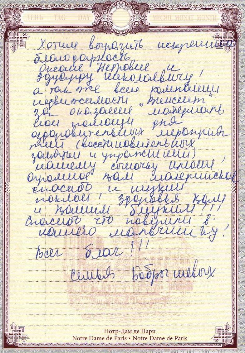 Хотим выразить искреннюю благодарность Эдуарду Николаевичу и Оксане Петровне за оказание материальной помощи для оздоровительных мероприятий нашему сыночку Илюше! Огромное Вам материнское спасибо и низкий поклон! Здоровья Вам и Вашим близким! Спасибо, что поверили в нашего мальчишку! Всех благ!