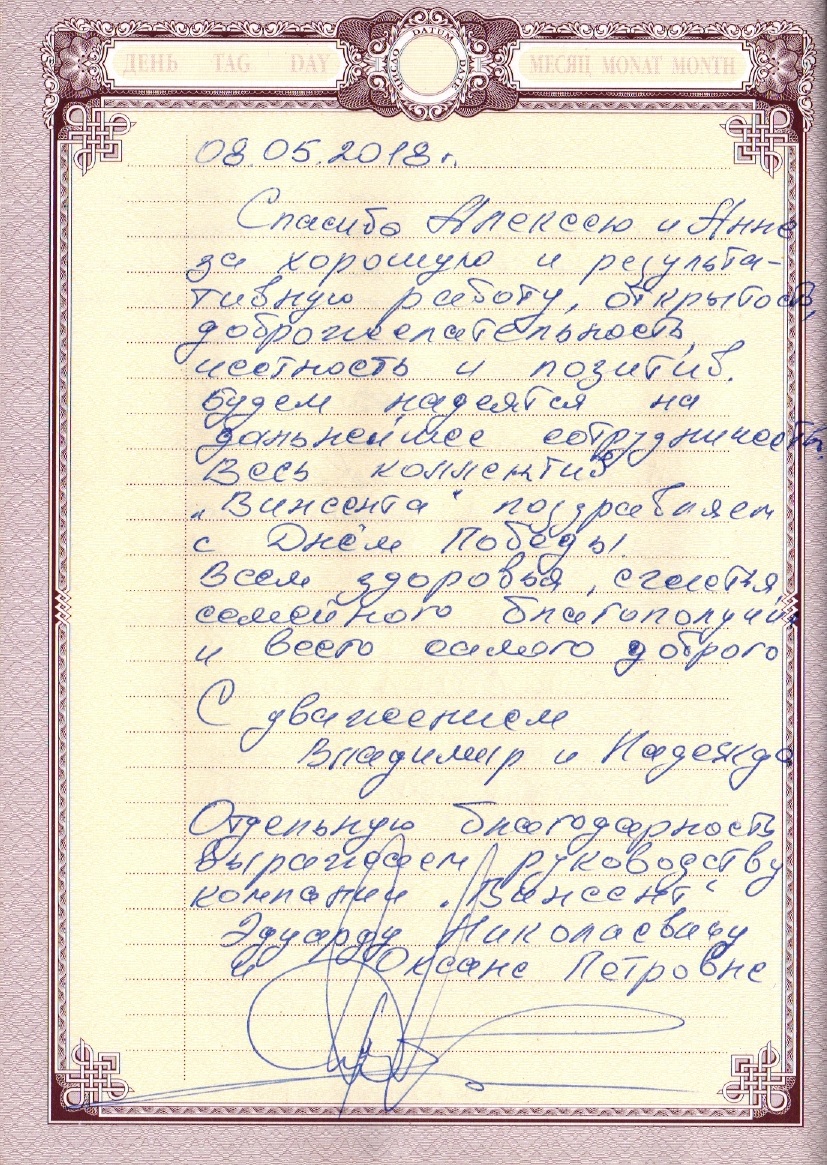 Огромную благодарность выражаем руководству компании «Винсент недвижимость» — Эдуарду Николаевичу и Оксане Петровне, а также Вашим сотрудникам Кокоеву Алексею и Пименовой Анне за хорошую и результативную работу, открытость, доброжелательность, честность и позитив. Будем надеяться на дальнейшее сотрудничество. Весь коллектив ООО «Винсент недвижимость» поздравляем с Днем Победы! Всем здоровья, счастья, семейного благополучия и всего самого доброго.