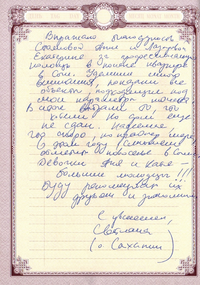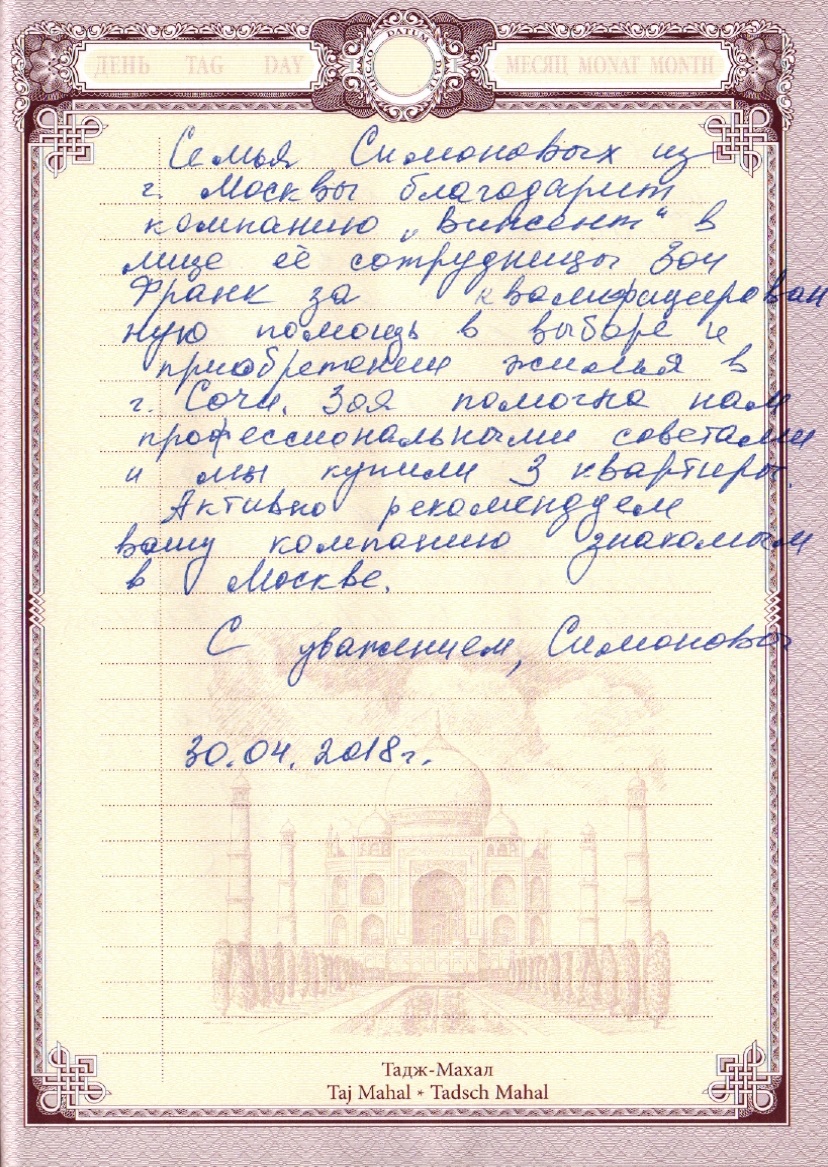 Семья Симоновых из г. Москвы благодарит компанию «Винсент Недвижимость» в лице её сотрудницы Зои Франк за помощь в выборе и приобретении жилья в г. Сочи. Зоя помогла нам профессиональными советами, и мы купили 3 квартиры. Активно рекомендуем вашу компанию знакомым в Москве.