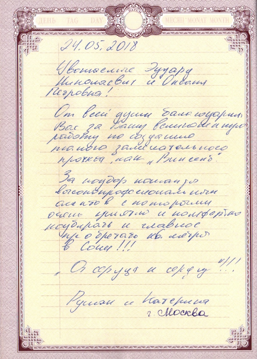 От всей души благодарим за Вашу великолепную работу по созданию такого замечательного проекта, как «Винсент Недвижимость» и за подбор высокопрофессиональных специалистов, с которыми очень приятно и комфортно работать и главное, приобретать квартиры в Сочи!