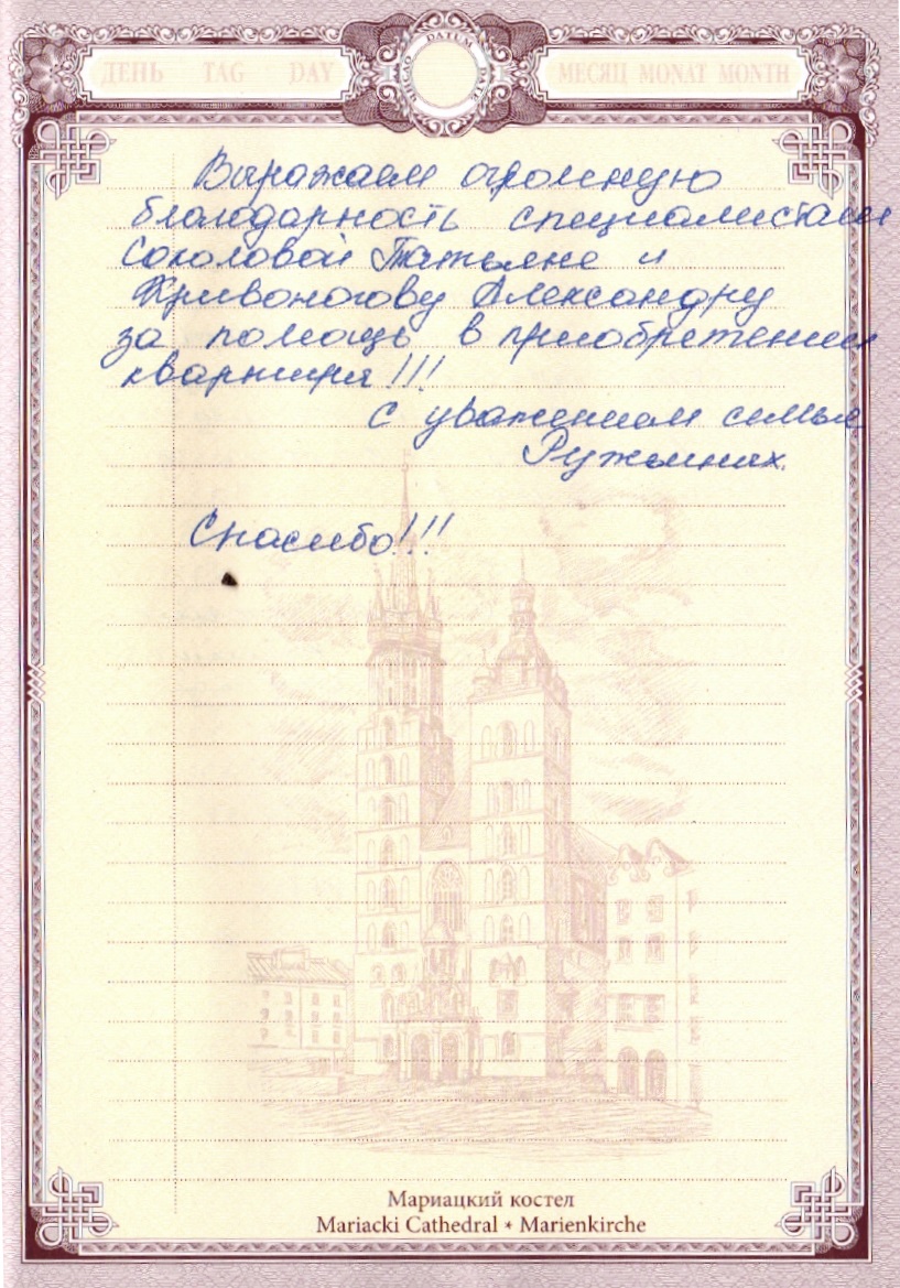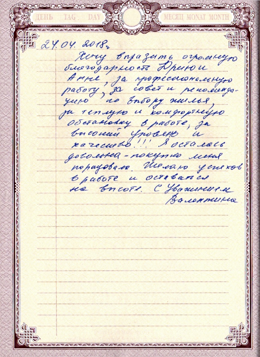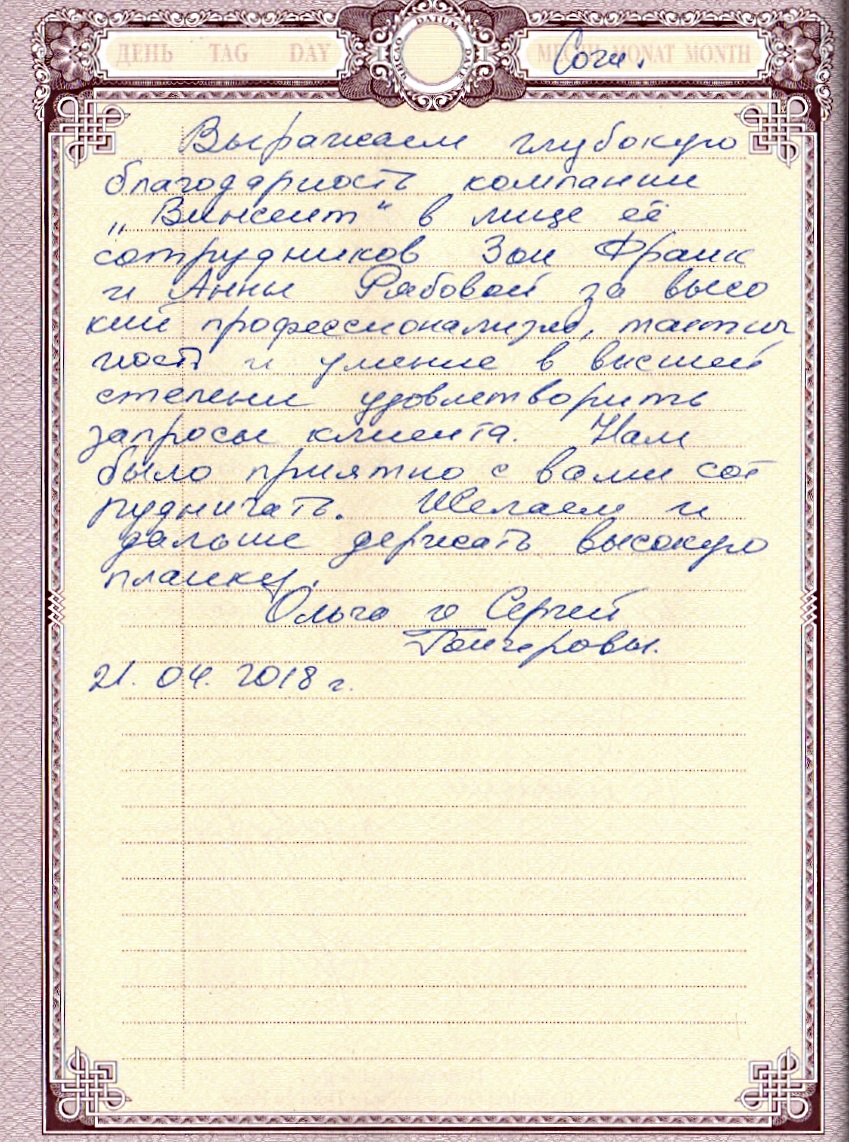 Выражаем глубокую благодарность компании «Винсент Недвижимость» в лице ее сотрудников Зои Франк и Анны Рябовой за высокий профессионализм, тактичность и умение в высшей степени удовлетворить запросы клиента. Нам было приятно с вами сотрудничать. Желаем и дальше держать высокую планку.