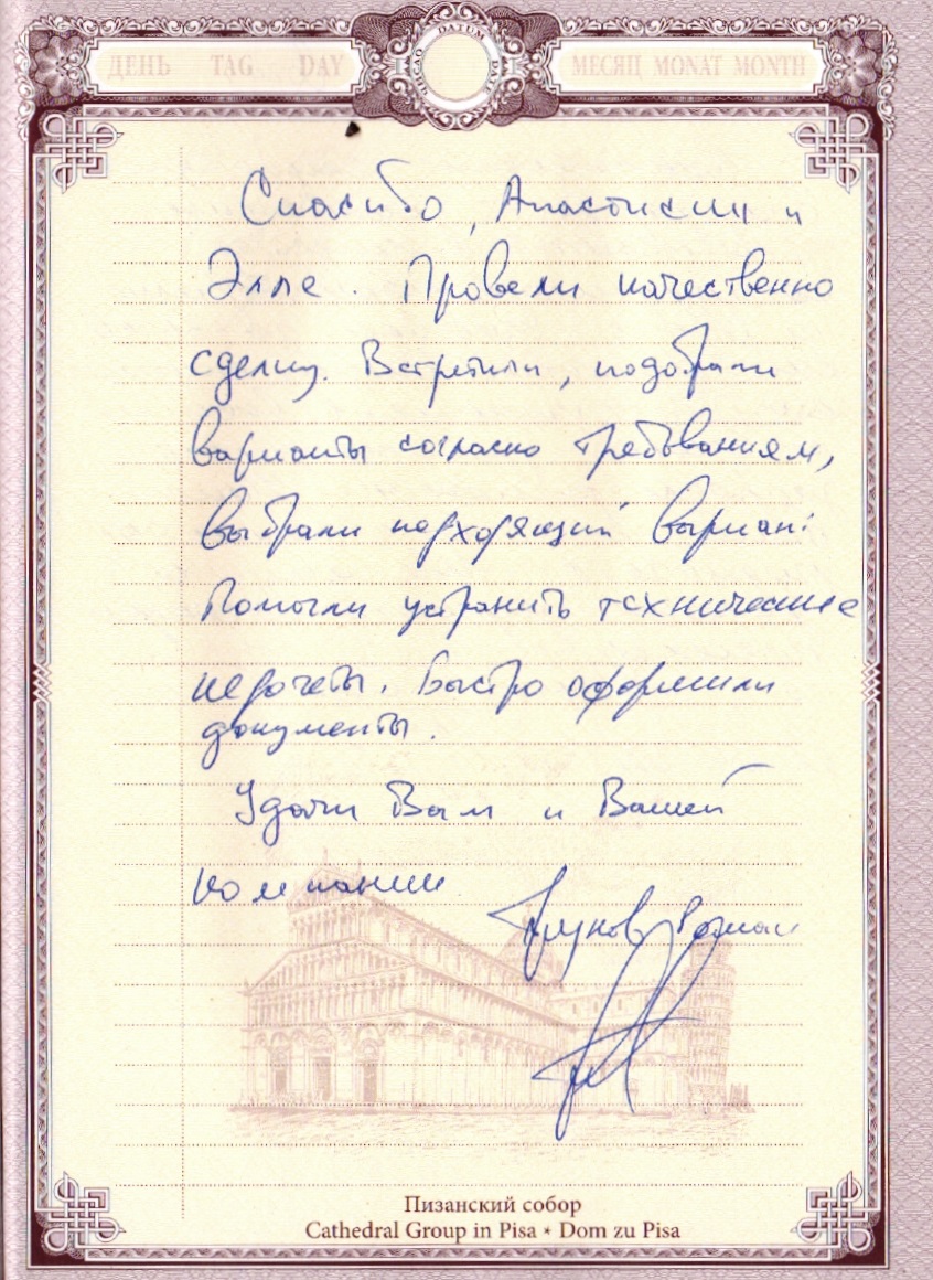 Артём, по десяти бальной шкале, вам оценка 10+! Вы показали себя, как высокого уровня профессионал, душевный человек и настоящий мужчина. Благодарю вас за всё! Эти 3 дня, вы были для меня другом, гидом, риэлтором и спасителем. Очень приятно было с вами иметь дело и просто общаться. Ощущение полной гармонии рядом с вами. Желаю вам успехов во всех сферах жизни и личного счастья.