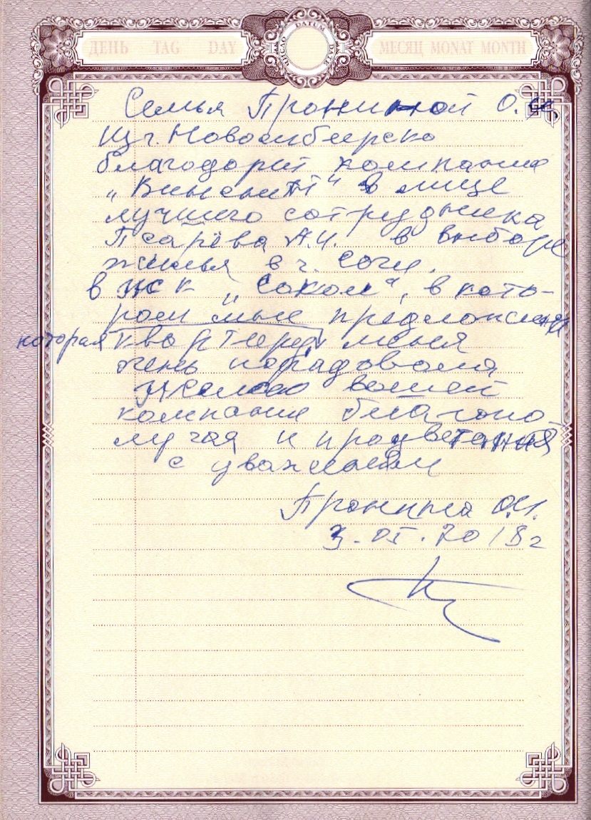 Семья Прониных благодарит компанию «Винсент недвижимость» в лице лучшего сотрудника Псарева Александра, за помощь в подборе жилья в г. Сочи, а именно в ЖК «Сокол». Желаю Вашей компании благополучия и процветания!