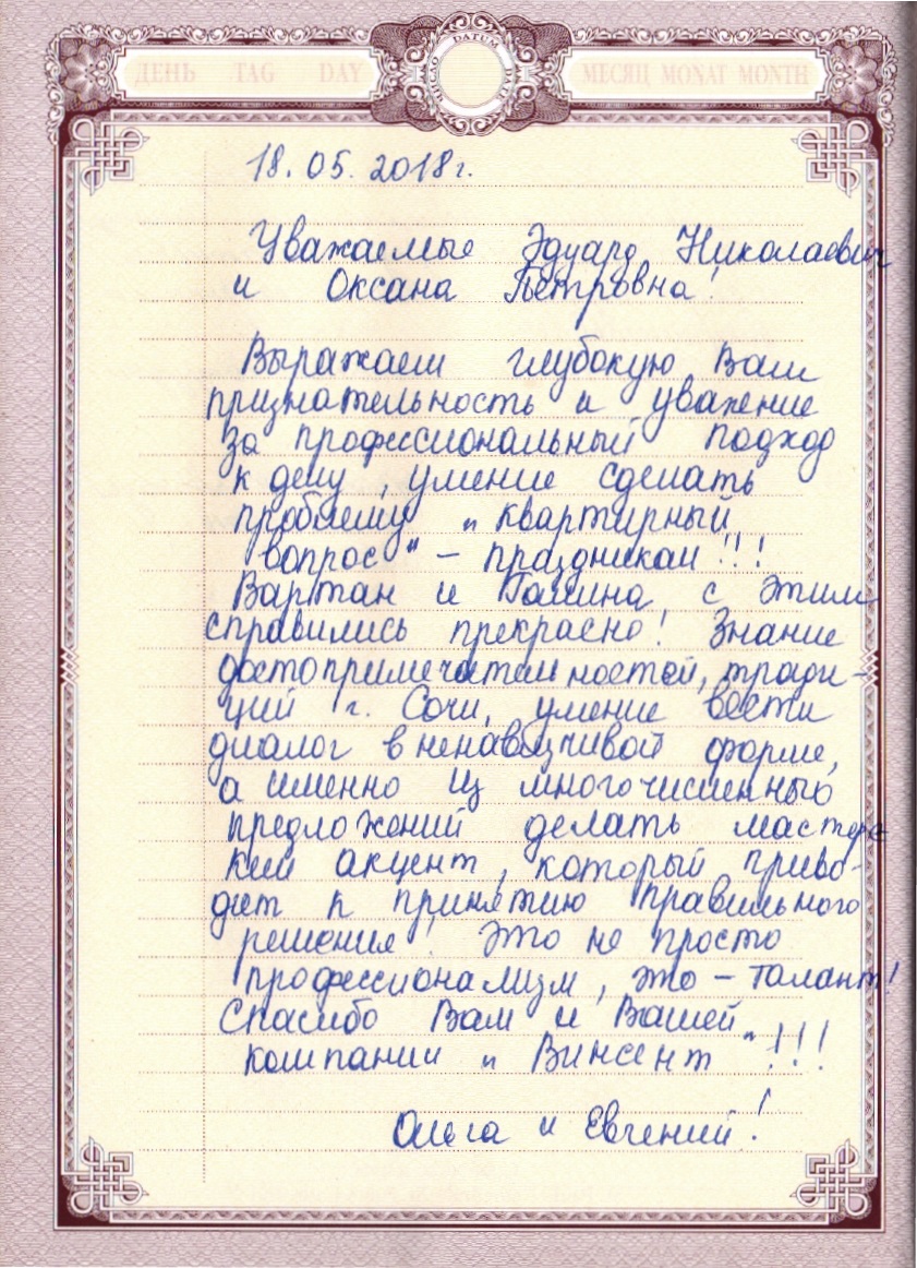 Выражаем глубокую Вам признательность и уважение за профессиональный подход к делу, умение сделать проблему «Квартирный вопрос» — праздником!!! Караугланов Вартан и Тимченко Галина с этим справились прекрасно! Знание достопримечательностей, традиций г. Сочи, умение вести диалог в ненавязчивой форме, а именно из многочисленных предложений делать мастерский акцент, который приводит к принятию правильного решения! Это не просто профессионализм, это — талант! Спасибо Вам и Вашей компании «Винсент Недвижимость»!!!