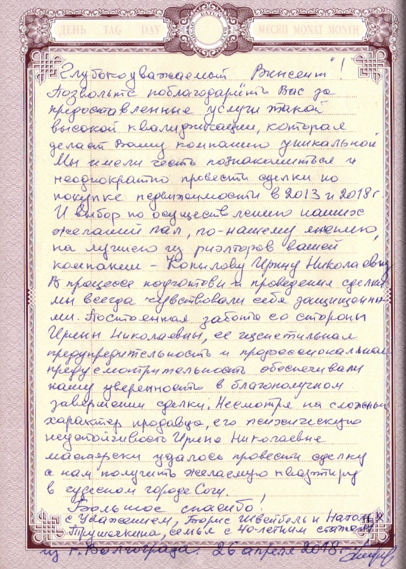 Глубокоуважаемый «Винсент»! Позвольте поблагодарить Вас за предоставленные услуги такой высокой квалификации, которая делает Вашу компанию уникальной. Мы имели честь познакомиться и неоднократно провести сделки по покупке недвижимости в 2013 и 2018 г. И выбор по осуществлению наших желаний пал, по-нашему мнению, на лучшего из риелторов Вашей компании- Копылову Ирину Николаевну. В процессе подготовки и проведении сделки мы всегда чувствовали себя защищенными. Постоянная забота со стороны Ирины Николаевны, ее щепетильная предупредительность обеспечивали нашу уверенность в благополучном завершении сделки. Несмотря на сложный характер продавца, его психическую неустойчивость Ирине Николаевне мастерски удалось провести сделку, а нам получить желаемую квартиру в чудесном городе Сочи. Большое спасибо! С уважением Борис Швейбель и Наталья Трушечкина, семья с 40-летним стажем из г. Волгограда.