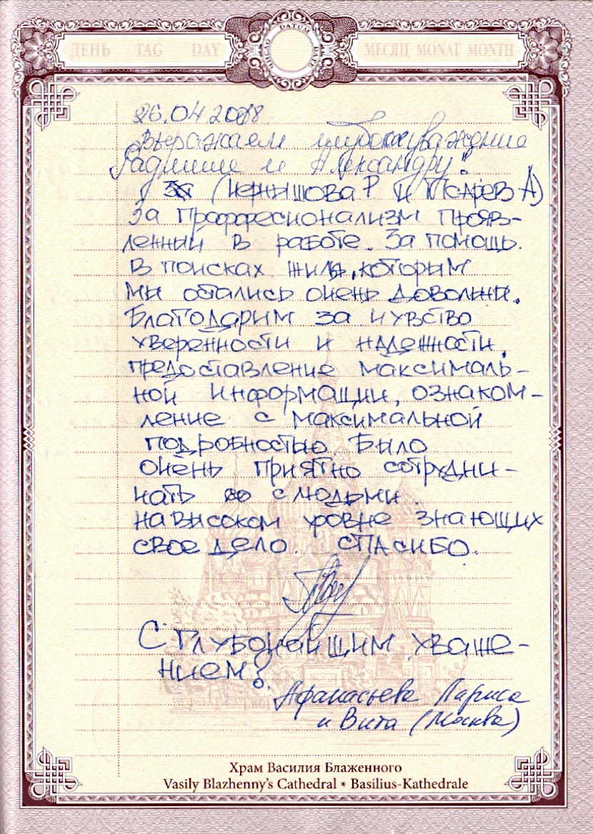 Выражаем глубокое уважение Чернышевой Радмиле и Псареву Александру! За профессионализм, проявленный в работе. За помощь в поиске жилья, которым мы остались очень довольны. Благодарим за чувство уверенности и надежности, предоставление максимальной информации, ознакомление с максимальной подробностью. Было очень приятно сотрудничать с людьми на высоком уровне знающих свое дело. Спасибо. С глубочайшим уважением!