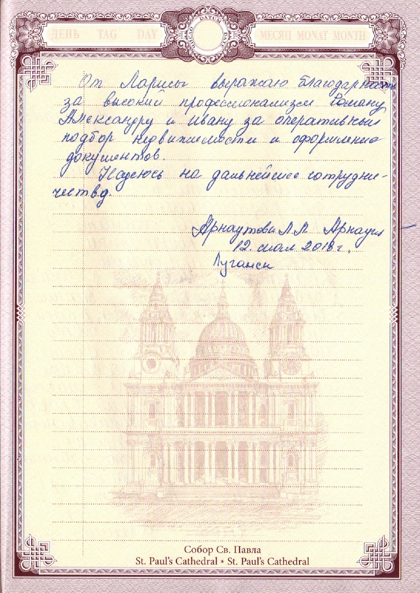 Выражаем огромную благодарность Ольге Жердевой и Игорю Филимоненко за высокий профессионализм, оперативность и ответственно выполненную работу в подборе и оформлении недвижимости. Желаем Вашей компании дальнейших успехов в работе, процветания, удачи в жизни, исполнения всего задуманного и всего самого наилучшего. Надеемся на дальнейшее взаимовыгодное сотрудничество.