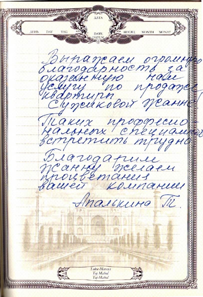 Выражаем огромную благодарность за оказанную нам услугу по продаже квартиры Сужиковой Жанне! Таких профессиональных специалистов встретить трудно. Благодарим Жанну желаем процветания вашей компании.