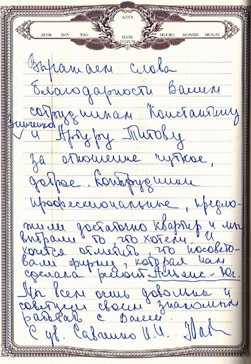 Выражаем слова благодарности Вашим сотрудникам Константину Зинченко и Артуру Титову за отношение чуткое, доброе. Сотрудники профессиональные, предложили достаточно квартир и мы выбрали то, что хотели. И хочется отметить, что посоветовали фирму, которая нам сделала ремонт «Альянс — Юг». Мы всем очень довольны и советуем своим знакомым работать с Вами.