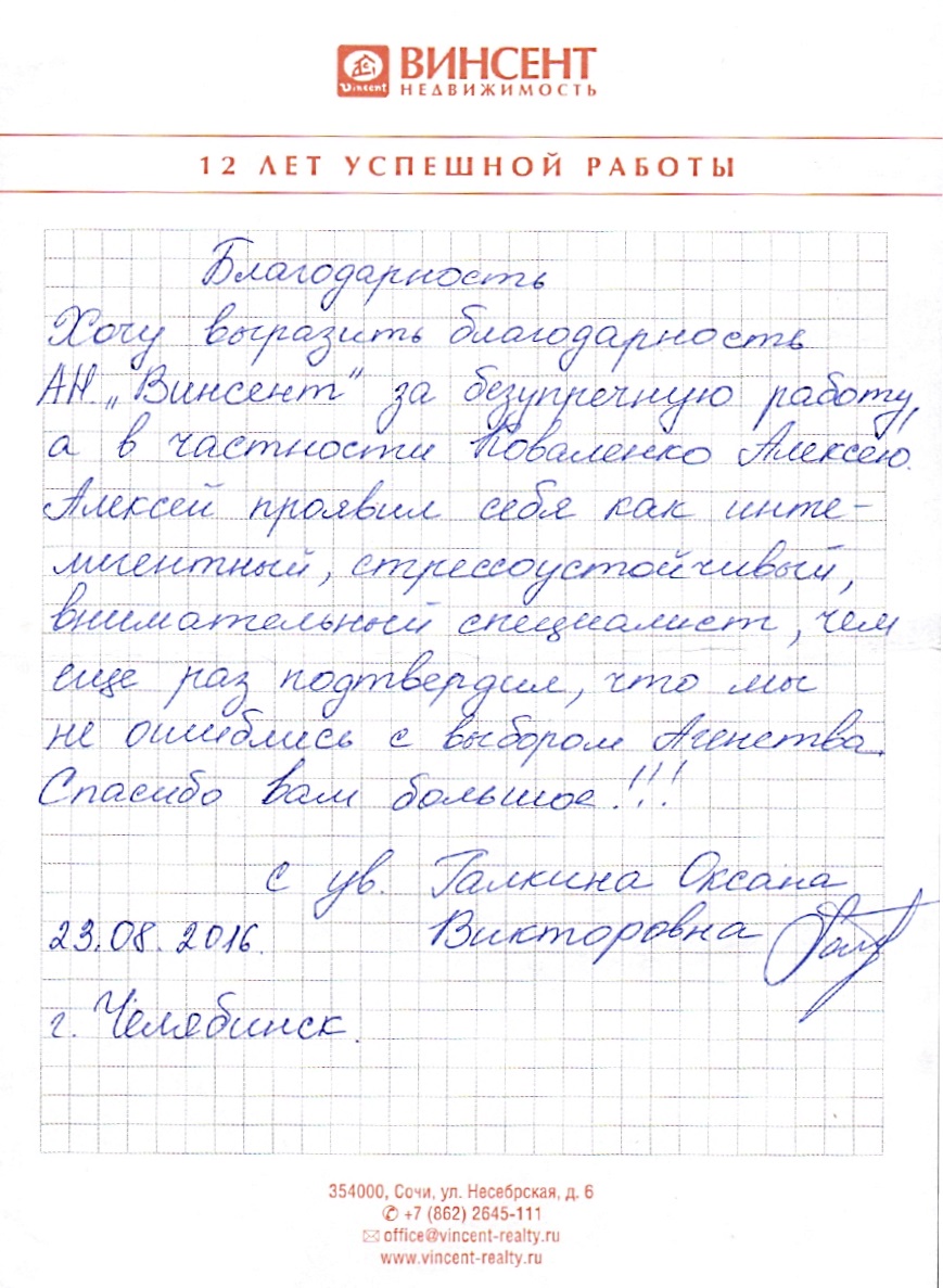 Большое человеческое спасибо агентству «Винсент-Недвижимость» и прекрасному специалисту Алексею Широкову. Благодаря его профессионализму и умению понять запросы клиента, покупка квартиры в г. Сочи прошла легко и быстро. Умение понять клиента, прекрасное знание рынка недвижимости, тактичность и дипломатичность, сделали процесс приобретения жилья неожиданно легким — я такого не ожидала. Огромное спасибо!