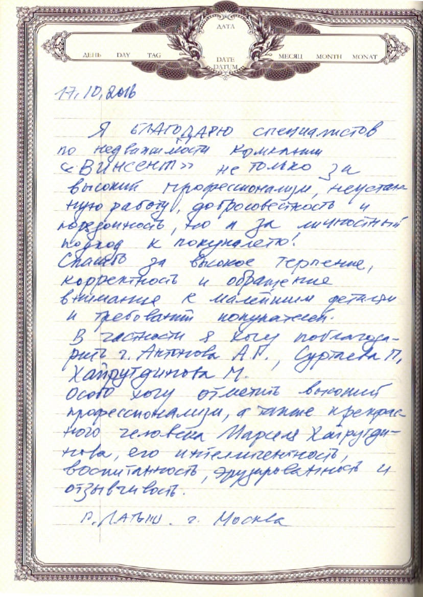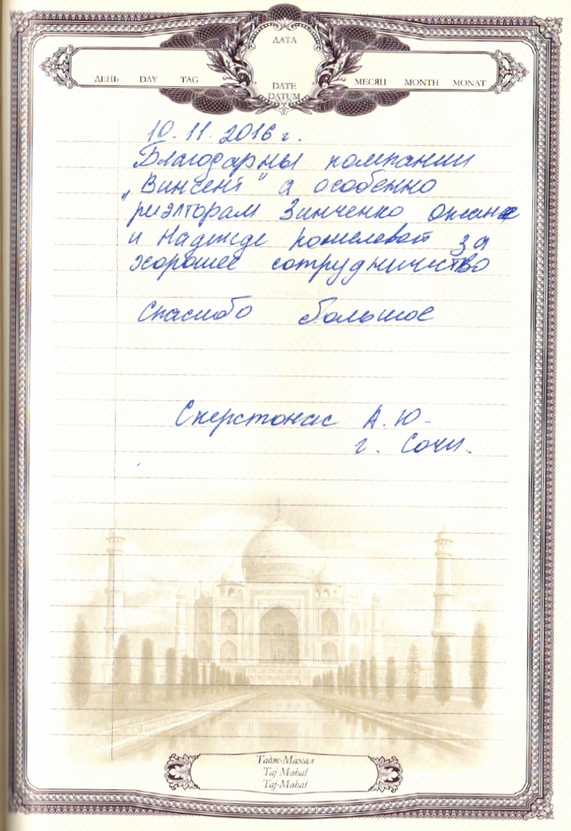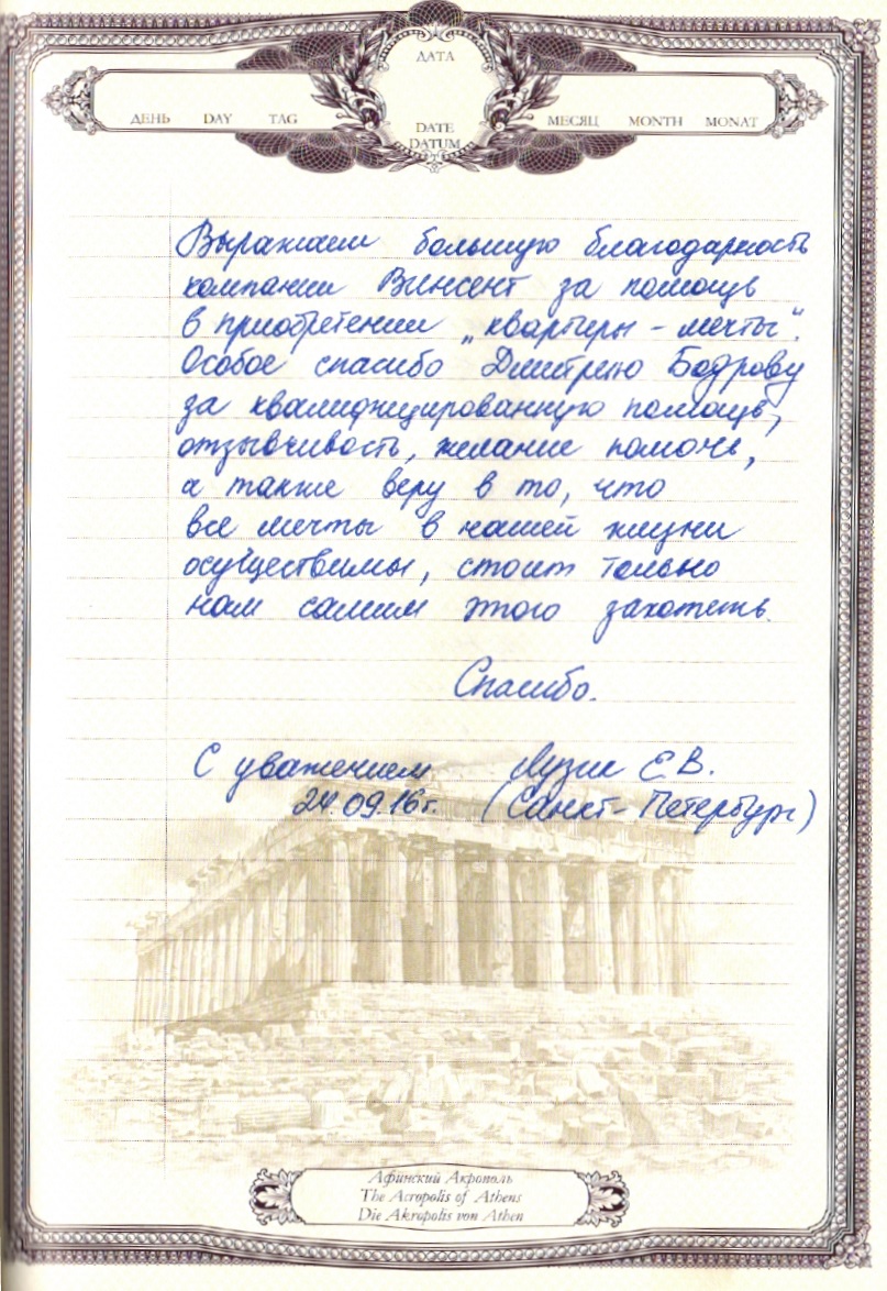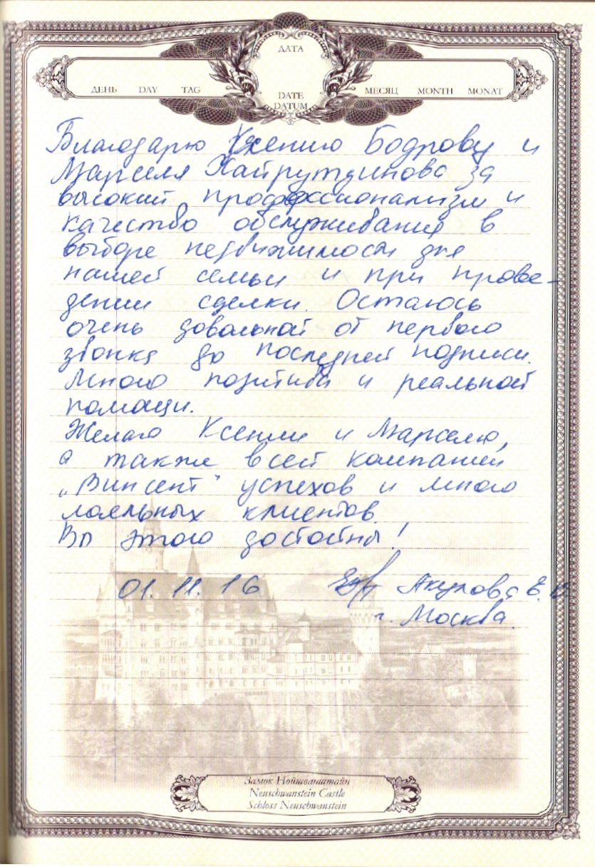 Выражаем большую благодарность компании Винсент за помощь в приобретении «квартиры — мечты». Особое спасибо Дмитрию Бодрову за квалифицированную помощь, отзывчивость, желание помочь, а также веру в то, что все мечты в нашей жизни осуществимы, стоит только нам самим этого захотеть. Спасибо.