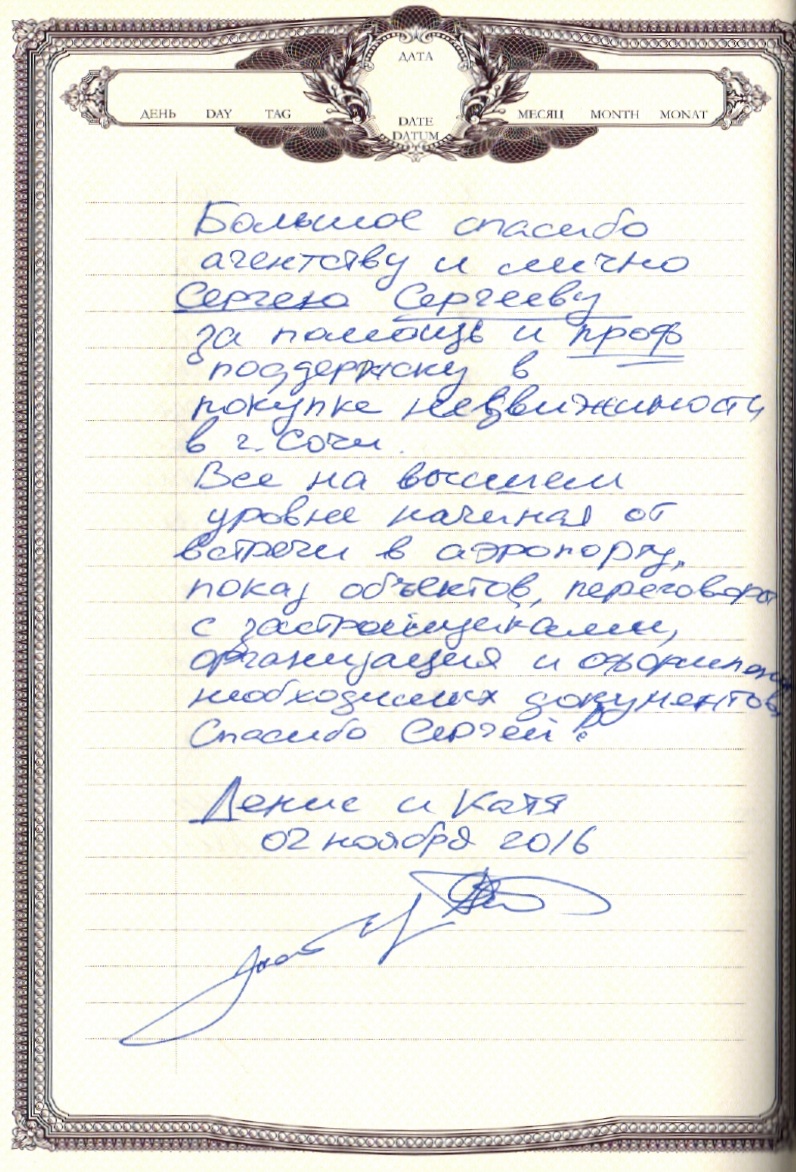 Большое спасибо агентству и лично Сергею Сергееву за помощь и проф. поддержку в покупке недвижимости в г. Сочи. Все на высшем уровне начиная от встречи в аэропорту, показ объектов, переговоры с застройщиками, организация и оформление необходимых документов. Спасибо Сергей!