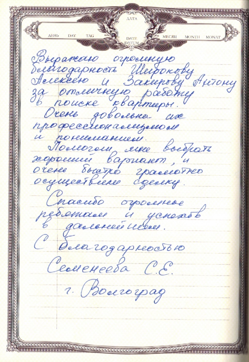 Выражаю огромную благодарность Широкову Алексею и Закирову Антону за отличную работу в поиске квартиры. Очень довольны их профессионализмом и пониманием. Помогли мне выбрать хороший вариант, и очень быстро и грамотно осуществили сделку. Спасибо огромное ребятам и успехов в дальнейшем. C благодарностью,Семенеева С. Е.