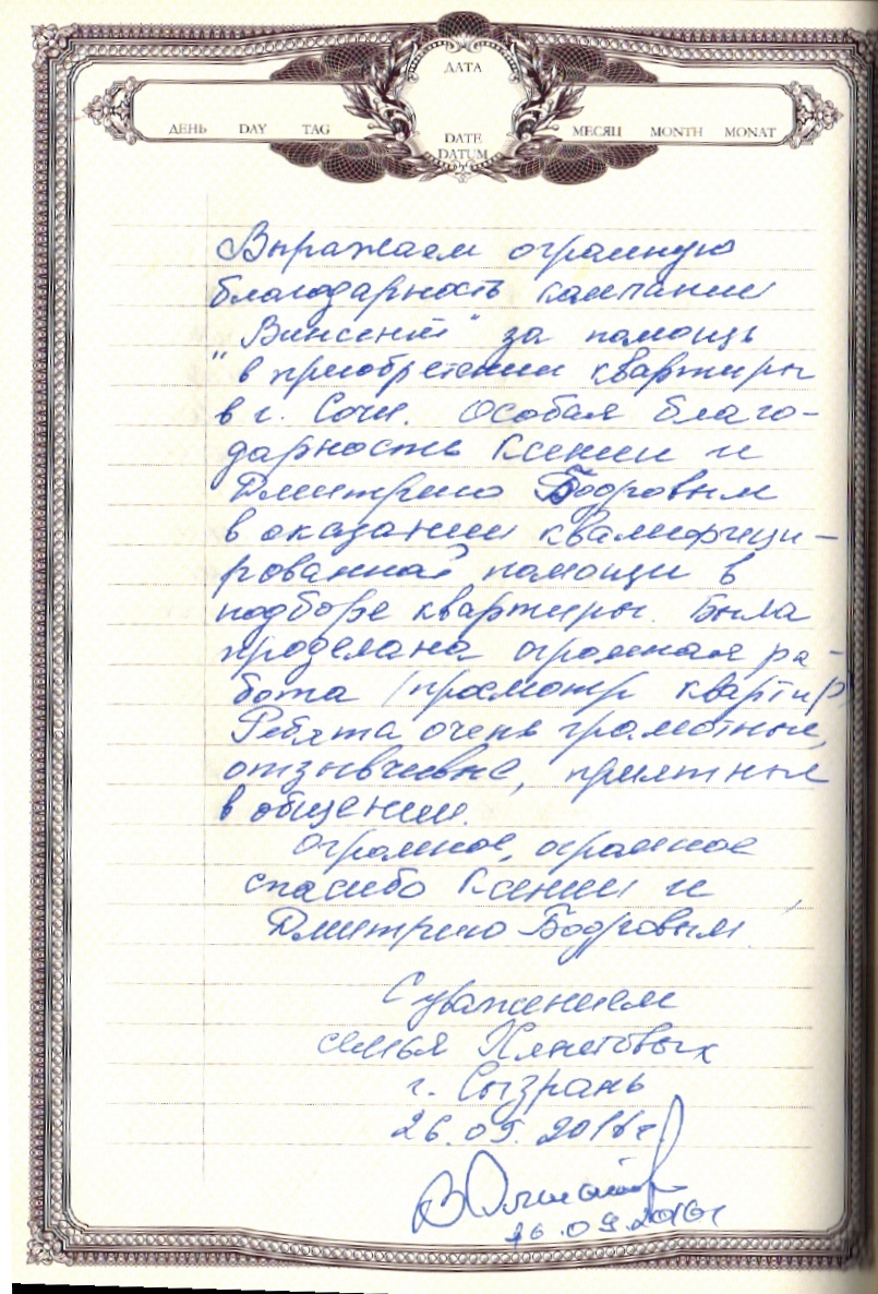 Выражаем огромную благодарность компании «Винсент-Недвижимость» за помощь в приобретении квартиры в г. Сочи. Особая благодарность Ксении и Дмитрию Бодровым в оказании квалифицированной помощи в подборе квартиры. Была проделана огромная работа (просмотр квартир, ребята очень грамотные, отзывчивые, приятные в общении.