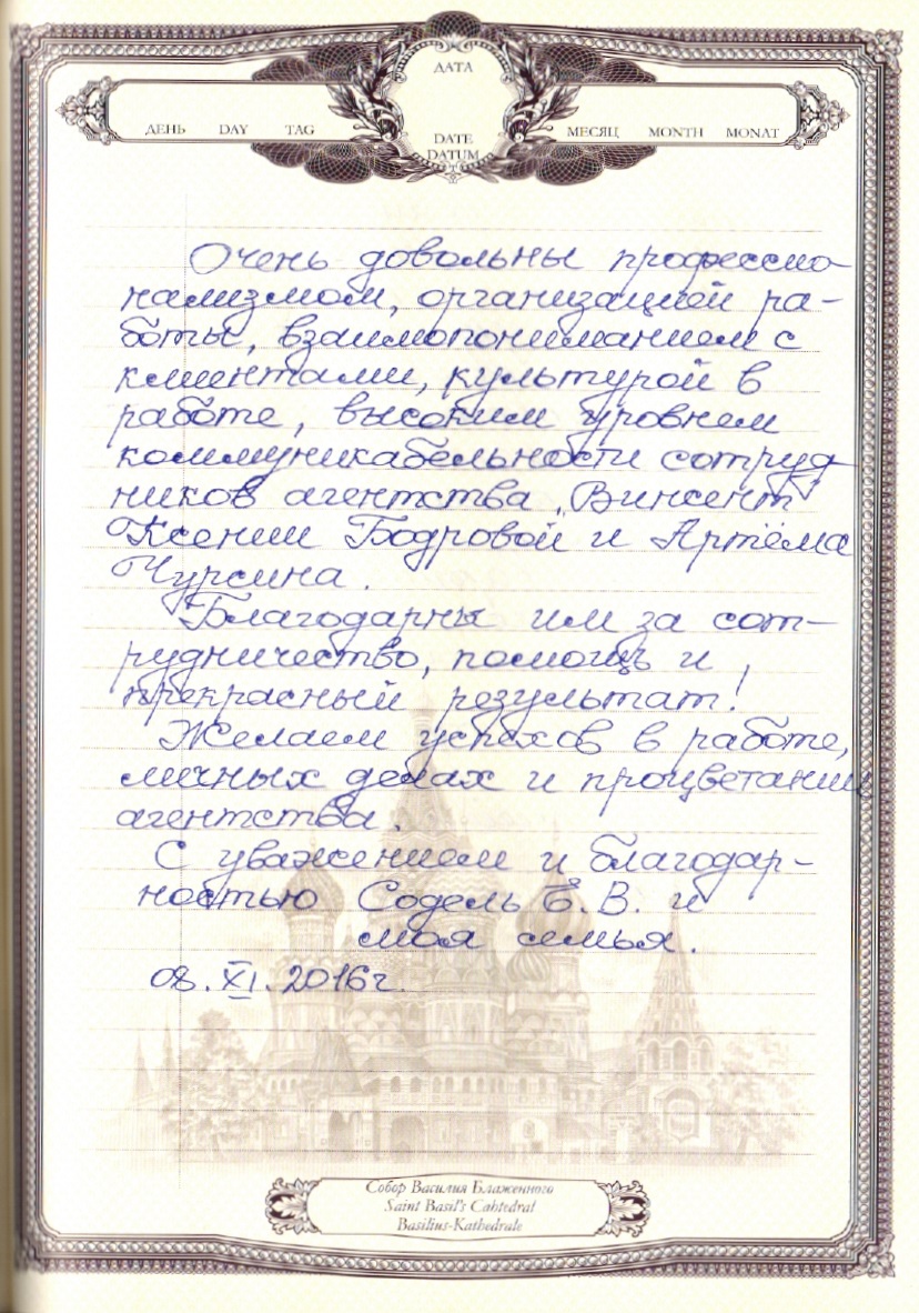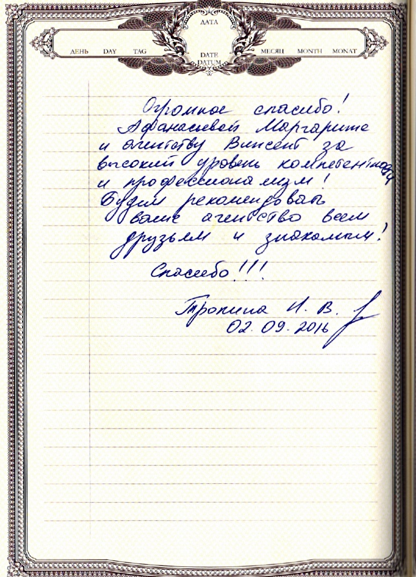 Огромное спасибо! Афанасьевой Маргарите и агентству Винсент за высокий уровень компетентности и профессионализм! Будем рекомендовать ваше агентство всем друзьям и знакомым! Спасибо!!!