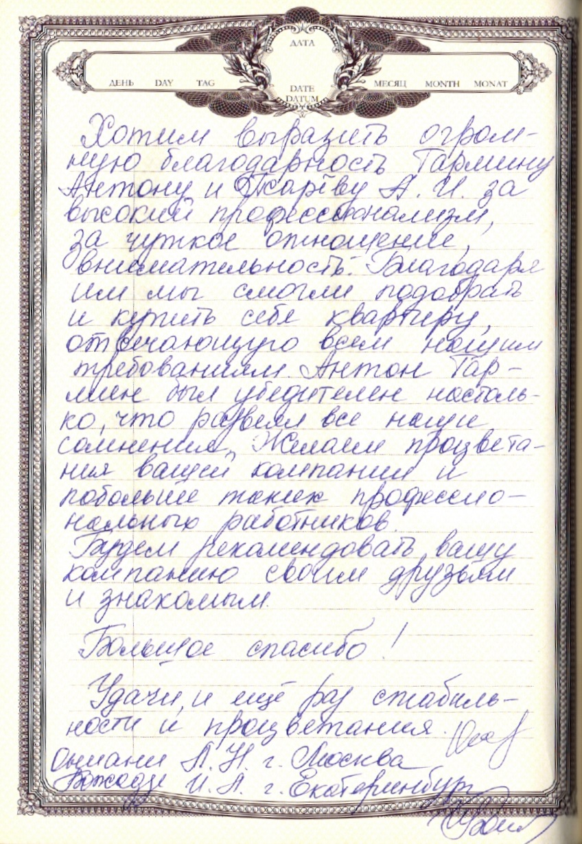 Хотим выразить огромную благодарность Тармину Антонуи Псареву А. И. за высокий профессионализм, за чуткое отношение, внимательность. Благодаря им мы смогли подобрать и купить себе квартиру, отвечающую всем нашим требованиям. Антон Тармин был убедителен настолько, что развеял все наши сомнения. Желаем процветания вашей компании и побольше таких профессиональных работников.