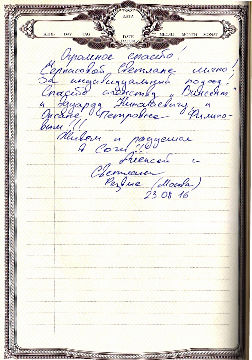 Огромное спасибо! Черкасовой Светлане лично! За индивидуальный подход! Спасибо и Эдуарду Николаевичу, и Оксане Петровне Филипповым!!! Живем и радуемся в Сочи!!!