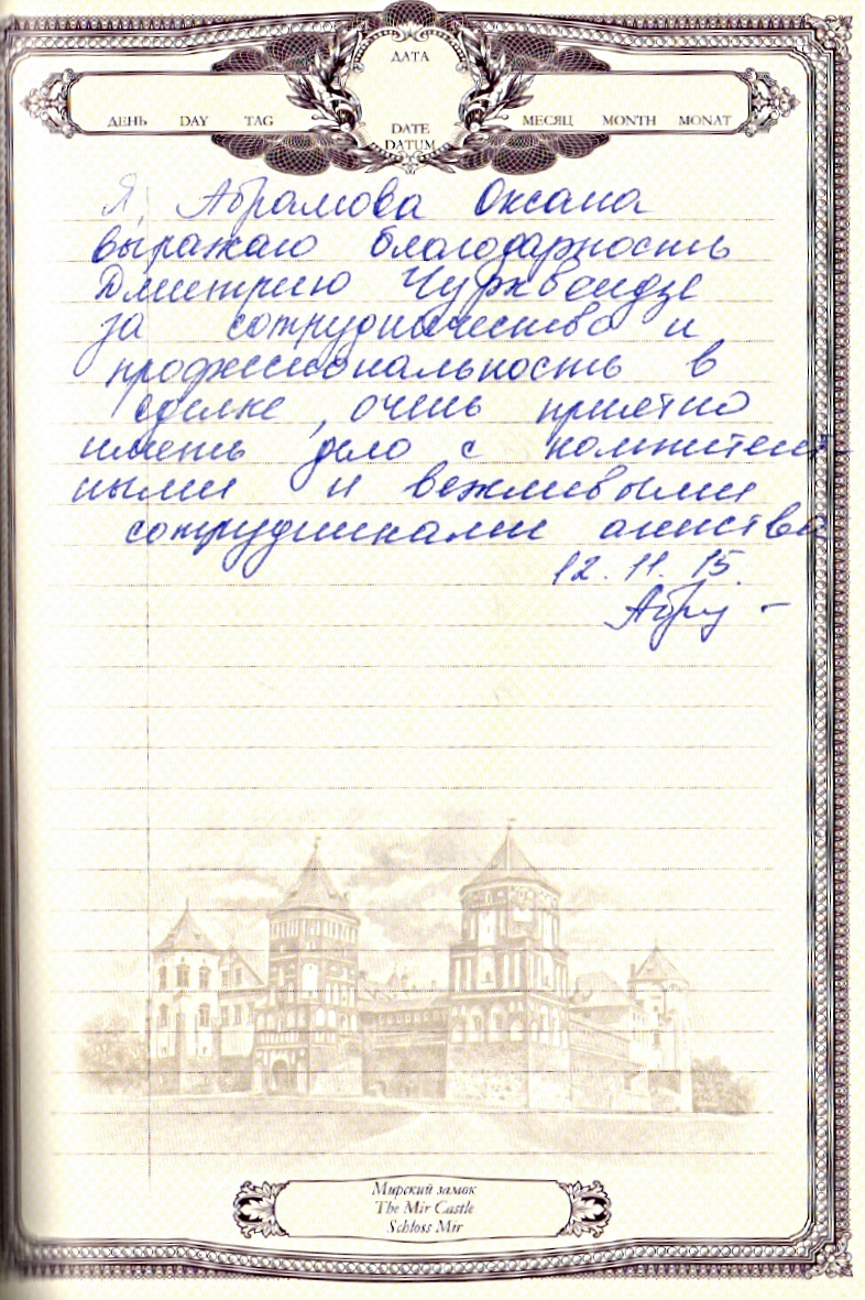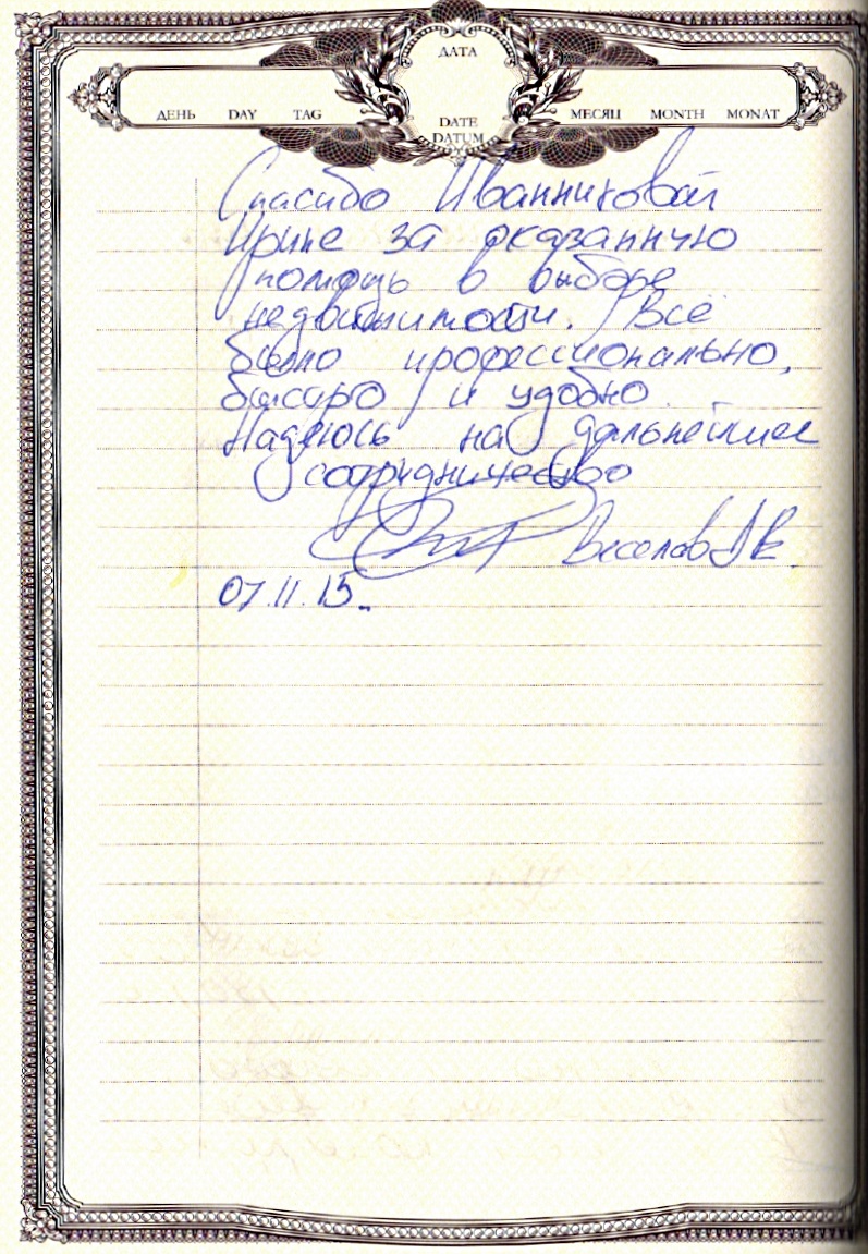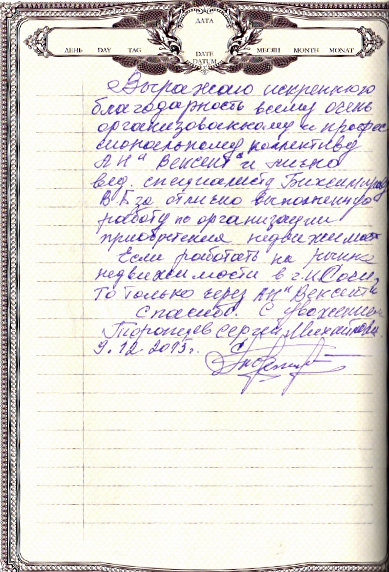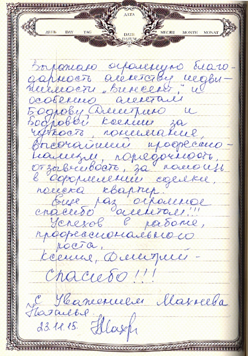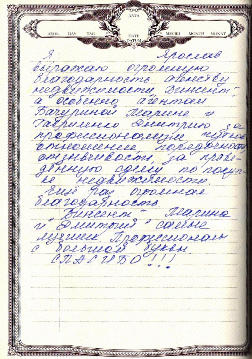 Выражаю огромную благодарность агентству «Винсент — Недвижимость», а особенно агентам Бачуриной Марине и Гавриленко Дмитрию за профессионализм, чуткое отношение, порядочность, ответственность, за проведенную сделку по покупке недвижимости. Еще раз огромная благодарность Вашему агентству. Вы профессионалы с большой буквы. Спасибо!