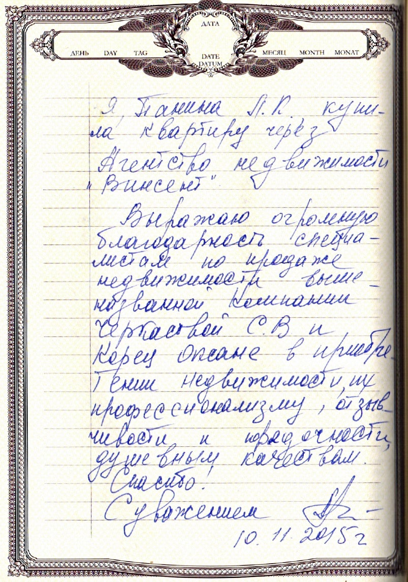 Я,Панина Л. К. купила квартиру через агентство «Винсент Недвижимость». Выражаю огромную благодарность специалистам по продаже недвижимости вышеназванной компании Черкасовой С. В. и Корец Оксане в приобретении недвижимости, их профессионализму, отзывчивости и порядочности, душевным качествам. Спасибо!