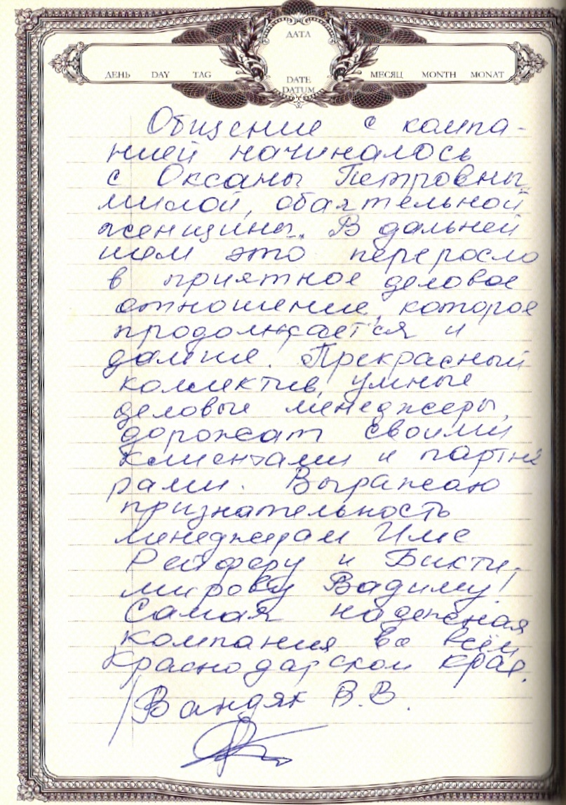 Общение с компанией началось с Оксаны Петровны, милой обаятельной женщины. В дальнейшем это переросло в приятное деловое отношение, которое продолжается по сей день! Прекрасный коллектив, умные деловые менеджеры, которые дорожат своими клиентами и партнерами. Выражаю признательность менеджерам Илье Рейферу и Биктимирову Вадиму! Самая надежная компания во всем Краснодарском крае!