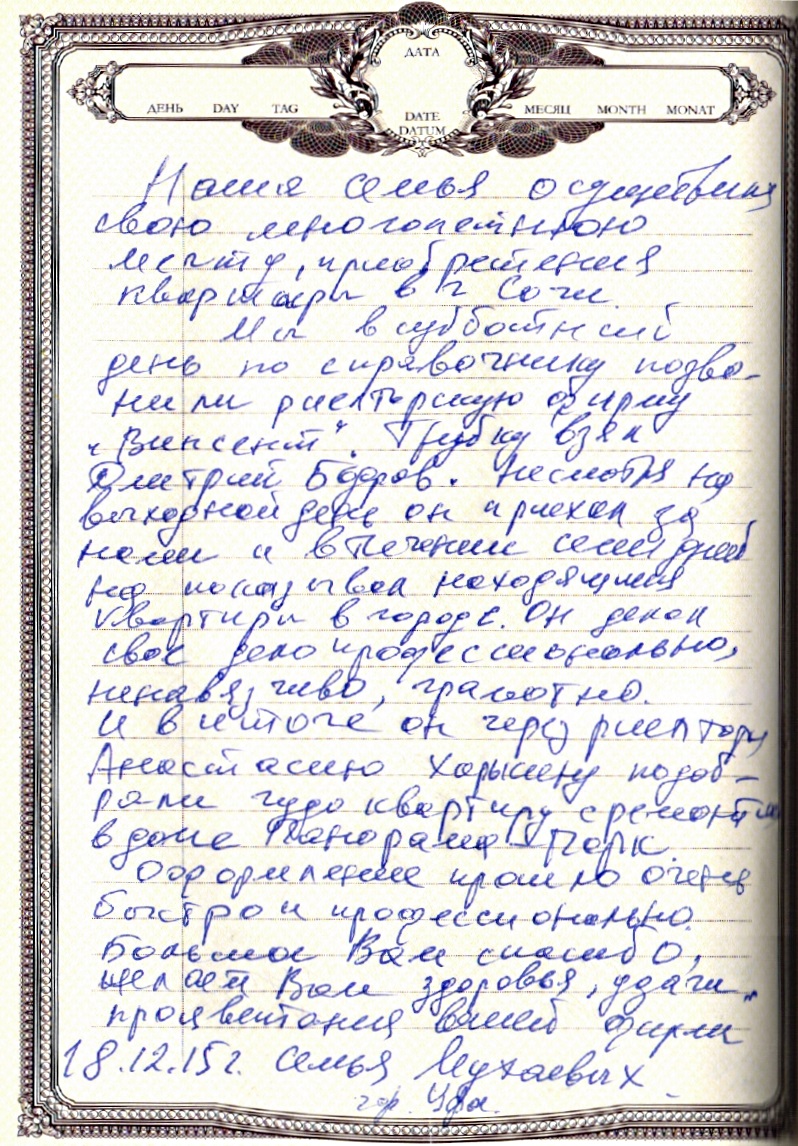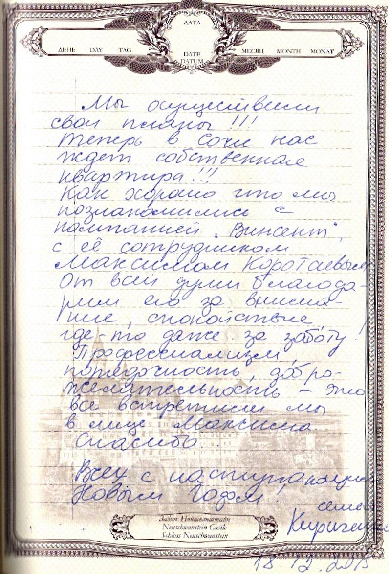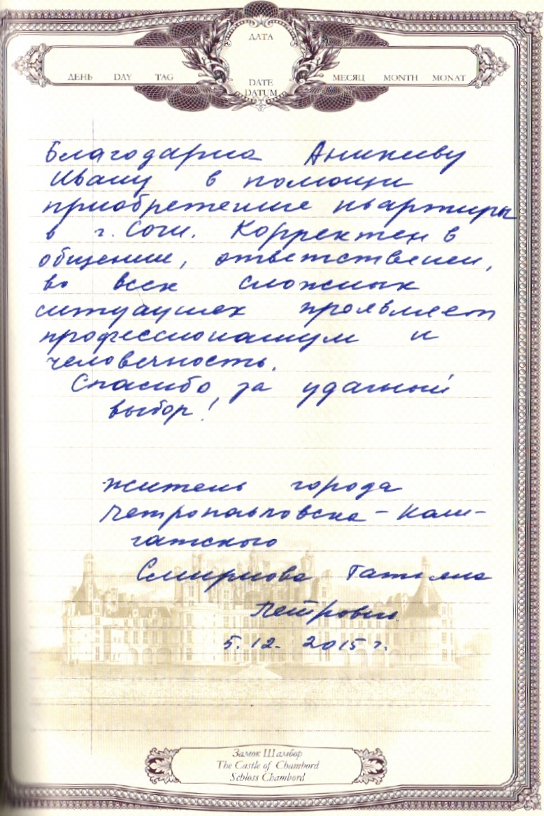 Наша семья осуществила свою многолетнюю мечту, приобретения квартиры в г. Сочи. Мы в субботний день по справочнику позвонили в компанию «Винсент». Ответил нам Дмитрий Бодров, несмотря на выходной день он приехал за нами и в течение семи дней показывал нам квартиры находящиеся в этом городе. Он очень грамотно и профессионально подошел к делу, был ненавязчив. В итоге Дмитрий вместе с еще одним риелтором Анастасией Харькиной подобрали чудо-квартиру с ремонтом в доме «Панорама Парк». Оформление прошло очень быстро и профессионально. Большое Вам спасибо, желаем Вам здоровья, удачи. Процветания Вашей фирме!