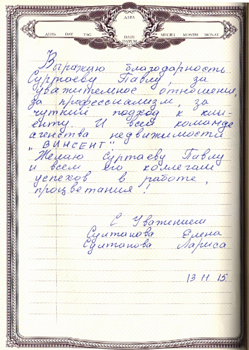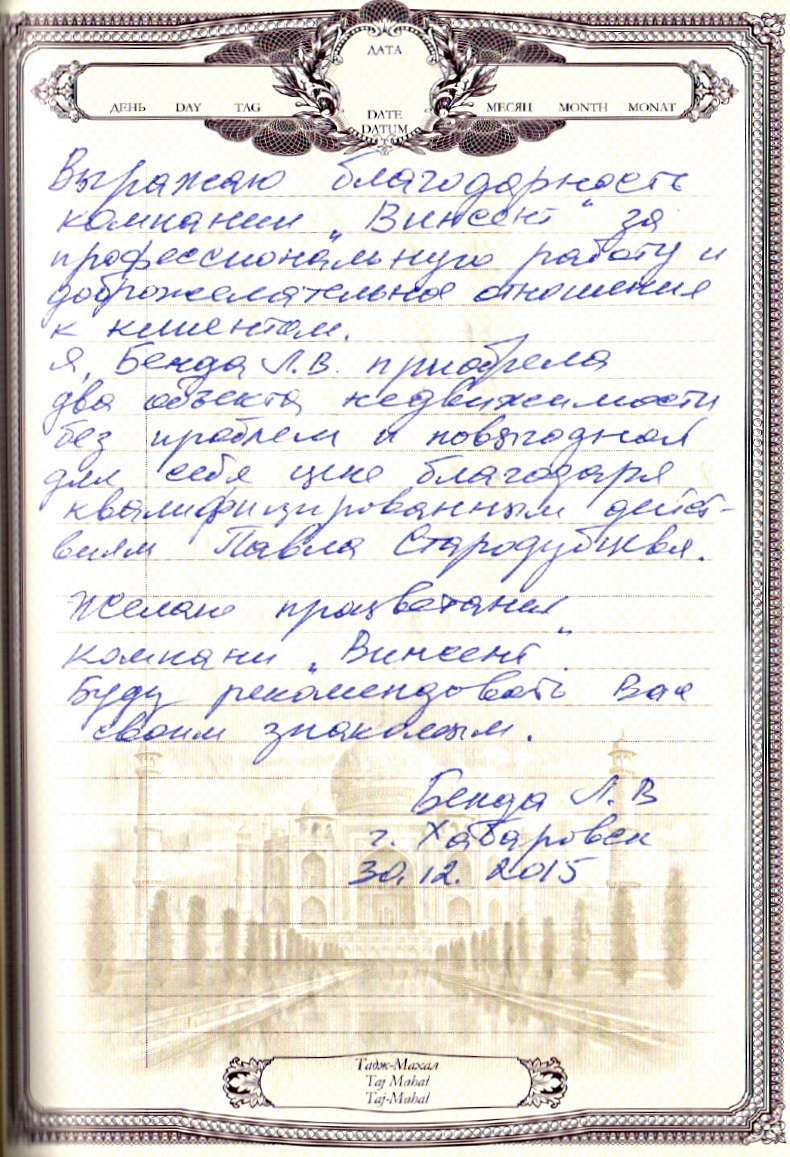 Выражаю благодарность компании «Винсент» за профессиональную работу и доброжелательное отношение к клиентам.Я Бенда Л. В. приобрела два объекта недвижимости без проблем и по выгодной для себя цене благодаря квалифицированным действиям Павла Стародубцева.