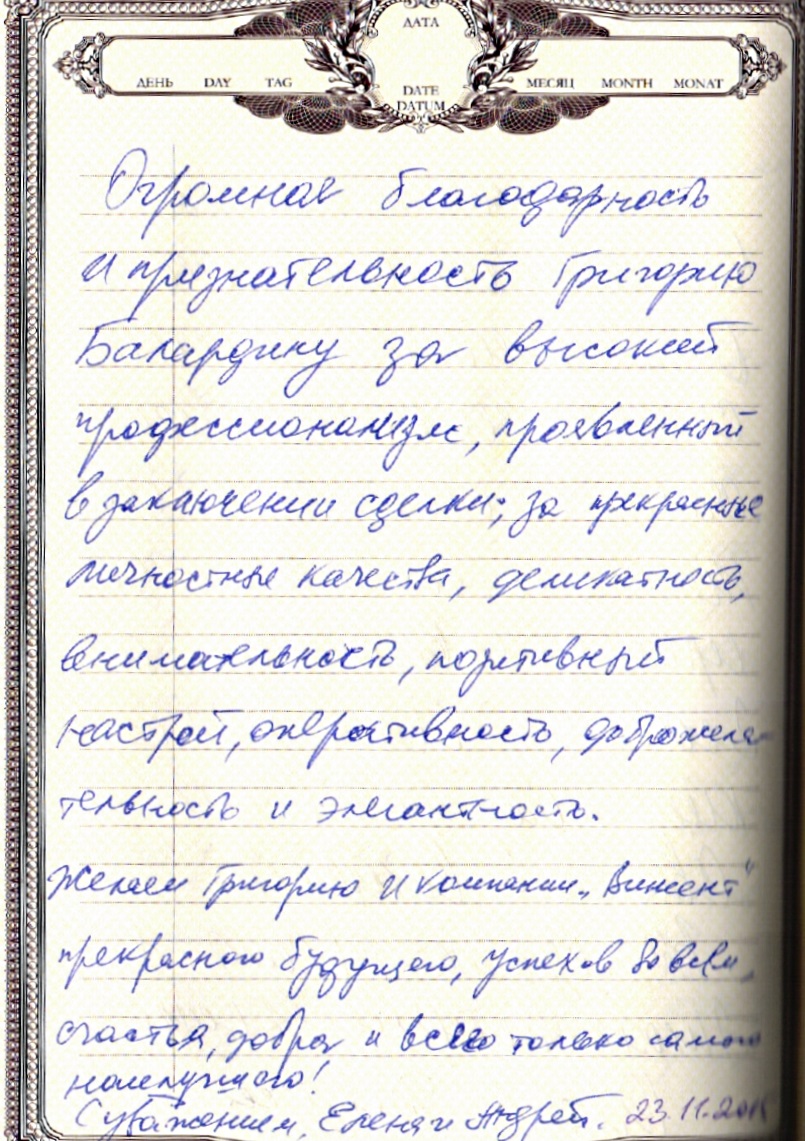 Огромная благодарность и признательность Григорию Балардину за высокий профессионализм проявленный в заключении сделки, за прекрасные личностные качества, деликатность, внимательность, позитивный настрой, оперативность, доброжелательность и элегантность. Желаем Григорию и компании «Винсент» прекрасного будущего, успехов во всем, счастья, добра и всего самого наилучшего !
