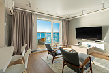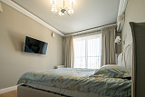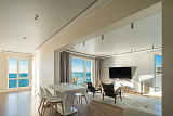 Авторский интерьер выдержан в светлой, свежей палитре, что визуально расширяет пространство и подчёркивает великолепные виды из окон. Мебель и техника подобраны в едином дизайнерском ключе — здесь каждая деталь работает на общую гармонию. Особое внимание уделено зонированию пространства: в квартире легко уединиться или собраться с семьей за обеденным столом, не нарушая уюта.