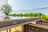 Отдельное преимущество пентхауса – это собственная открытая терраса с потрясающим панорамным видом на морскую акваторию и панораму центра Сочи. Терраса, к слову, благоустроена и адаптирована для вашего отдыха. Тут установлен комплект уличной мебели, выполнено озеленение оливковыми деревьями и пальмами.